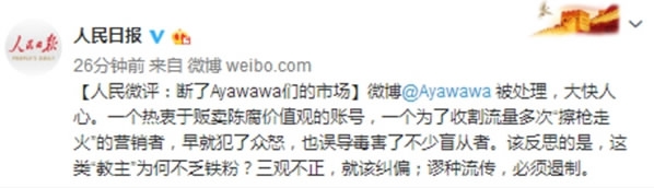 People’s Daily praised Weibo’s suspension of Ayawawa’s official account on Tuesday. /Screenshot of Weibo