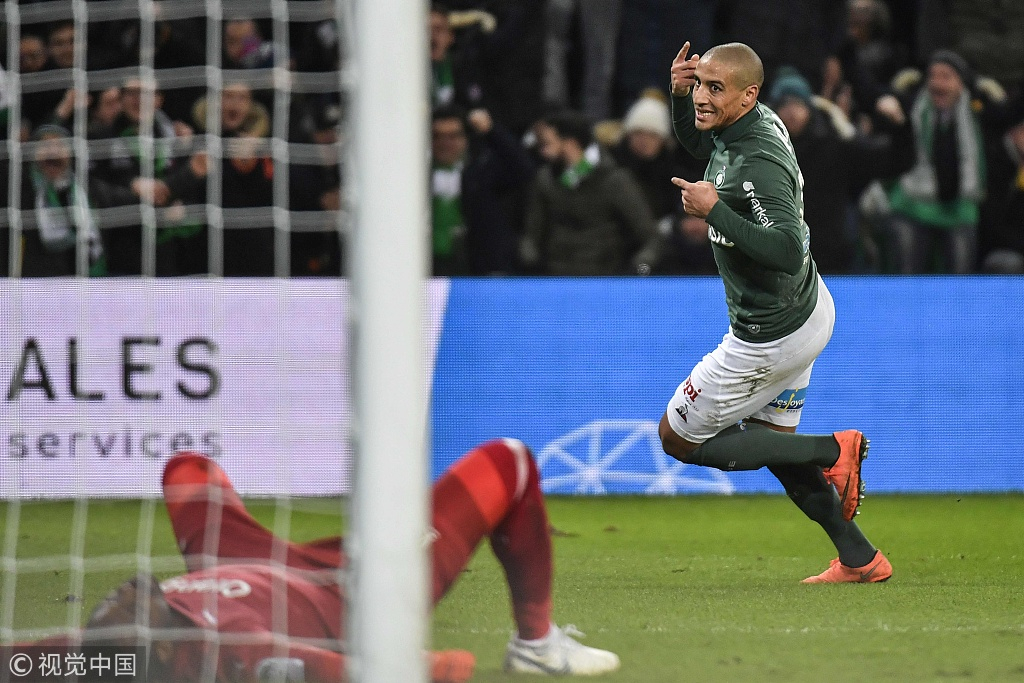 Saint-Etienne's Tunisian midfielder Wahbi Khazri celebrates after scoring a goal during the Ligue 1 match between AS Saint-Etienne and Olympique de Marseille at the Geoffroy Guichard stadium in Saint-Etienne, France, January 16, 2019. /VCG Photo