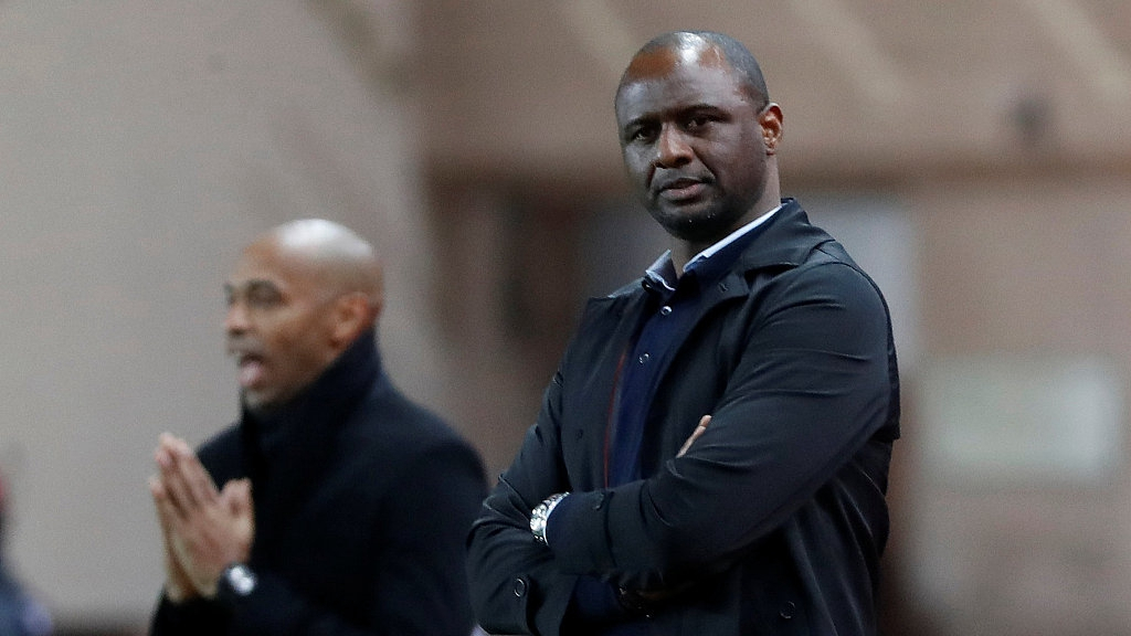 Monaco's coach Thierry Henry (L) and Nice's coach Patrick Vieira (R) during the Ligue 1 match between Monaco and Nice at the Louis II Stadium in Monaco, January 16, 2019. /VCG Photo