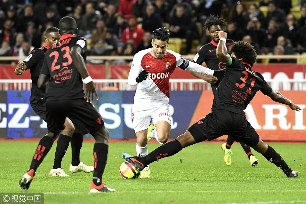 Monaco's Radamel Falcao (C) in action during the Ligue 1 match between Monaco and Nice at the Louis II Stadium in Monaco, January 16, 2019. /VCG Photo