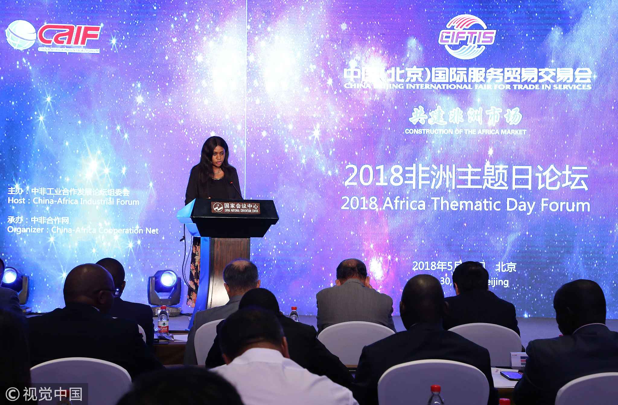 Gambian Deputy Ambassador to China delivers a speech at the African Theme Day Forum of the 2018 Beijing International Trade Fair, May 30, 2018. /VCG Photo