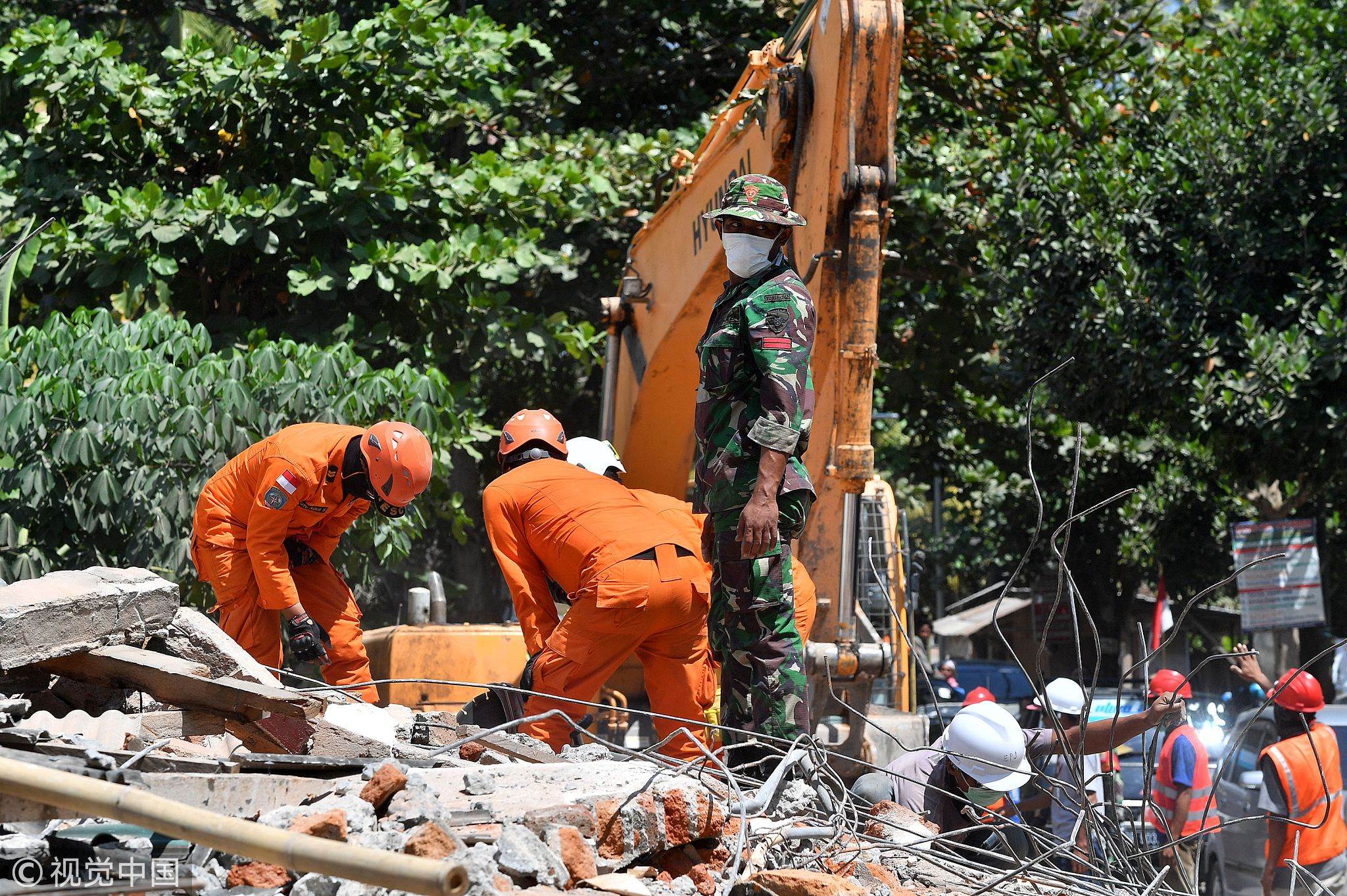 Members of an Indonesian search and rescue team look for victims of the recent quake on Lombok island, August 9, 2018. /VCG Photo