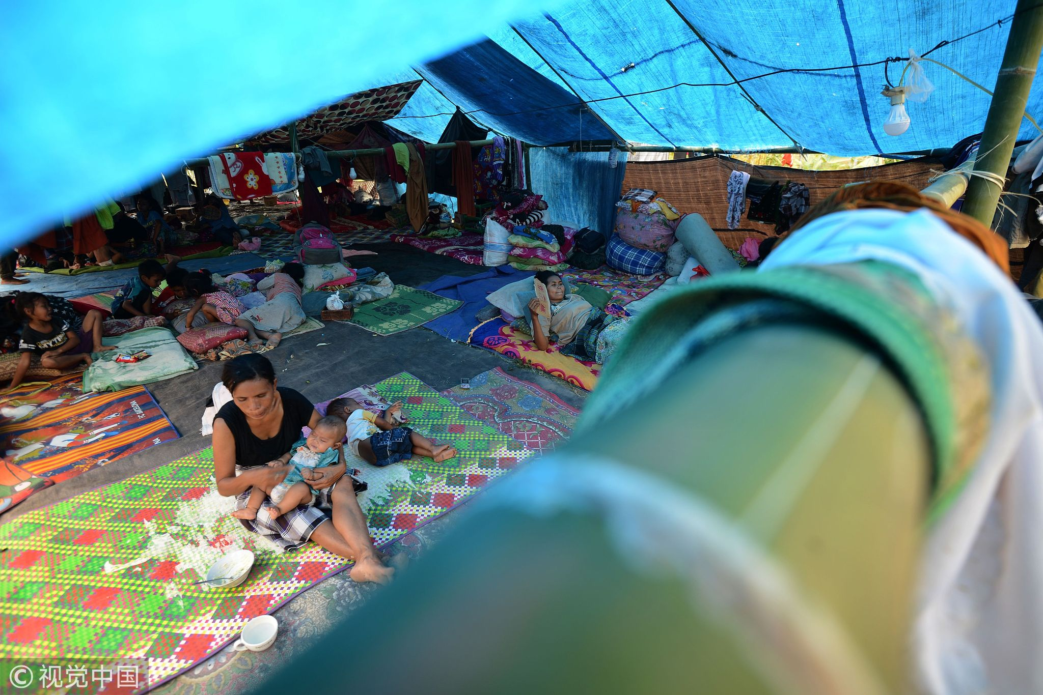 Displaced residents rest in tents set up in Kayangan in northern Lombok island, August 9, 2018, following the August 5 earthquake. /VCG Photo