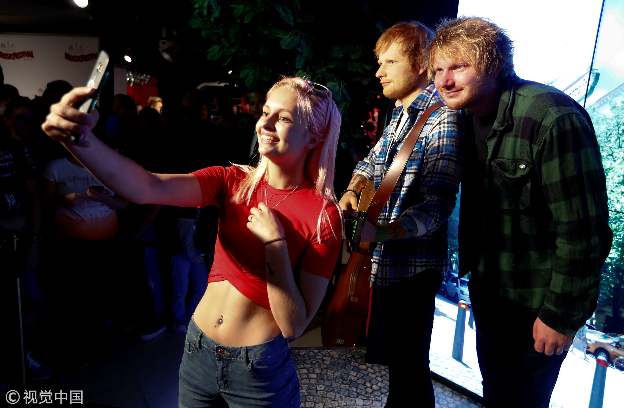 A visitor takes a selfie of Nico Eckl (R), lookalike of Ed Sheeran, as he poses beside a wax figure of musician Ed Sheeran in the Madame Tussauds wax museum in Berlin, Germany, July 17, 2018. /VCG Photo
