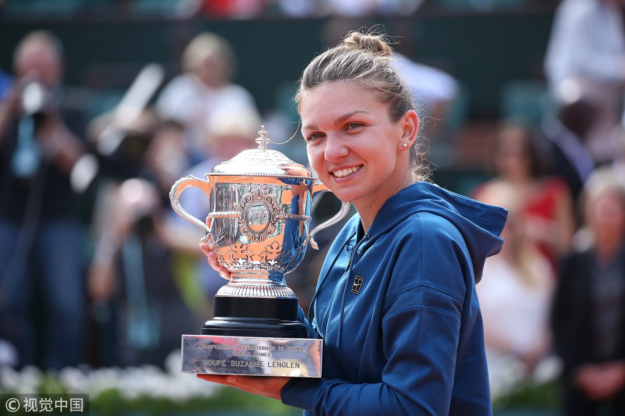 Simona Halep of Romania holds the championship trophy after winning her French Open women's final match against Stephens on June 9, 2018. /VCG Photo