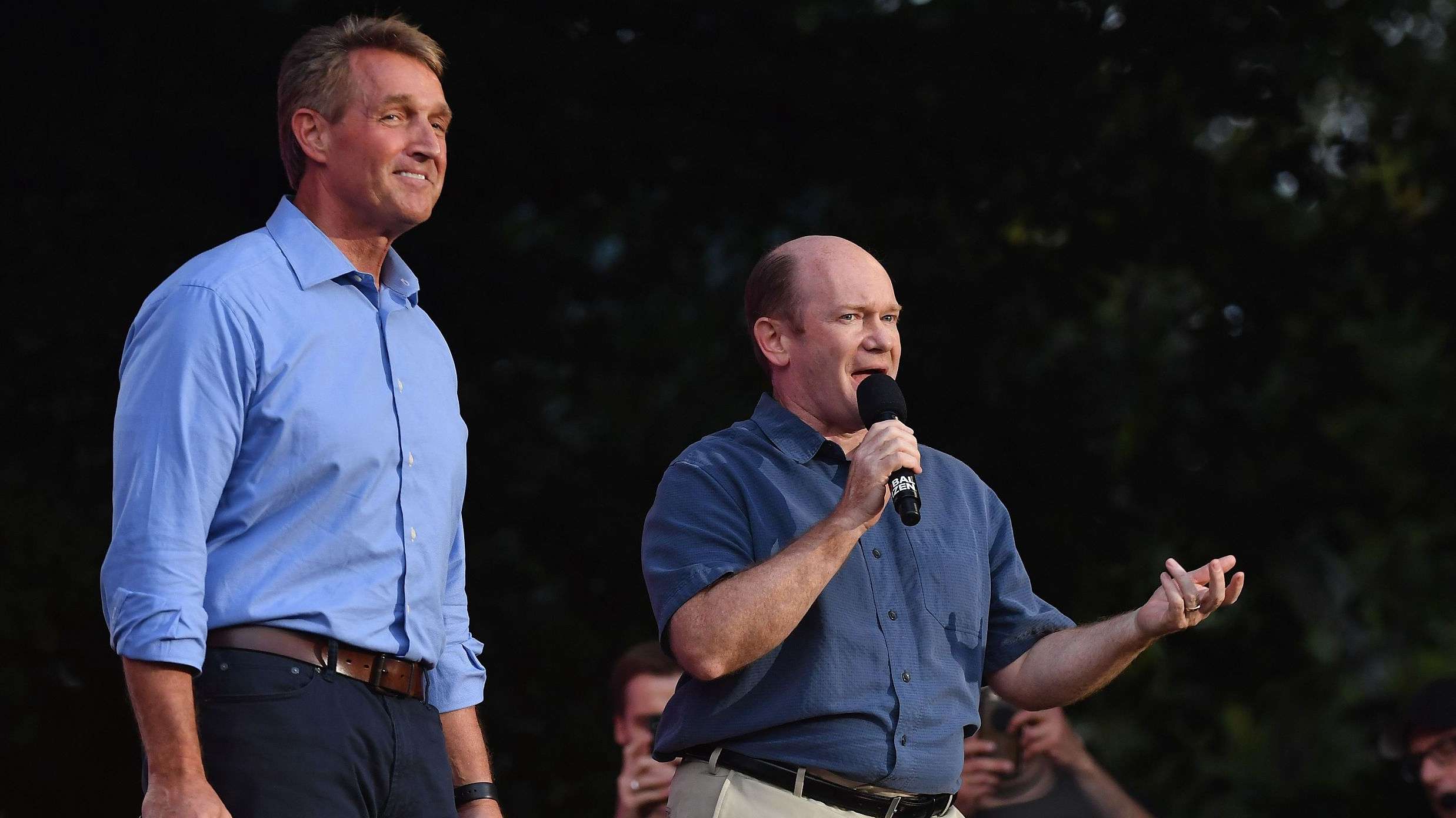 US senators Jeff Flake (L), Republican, and Chris Coons, Democrat, speak onstage during the 2018 Global Citizen Festival in New York City, September 29, 2018. /VCG Photo
