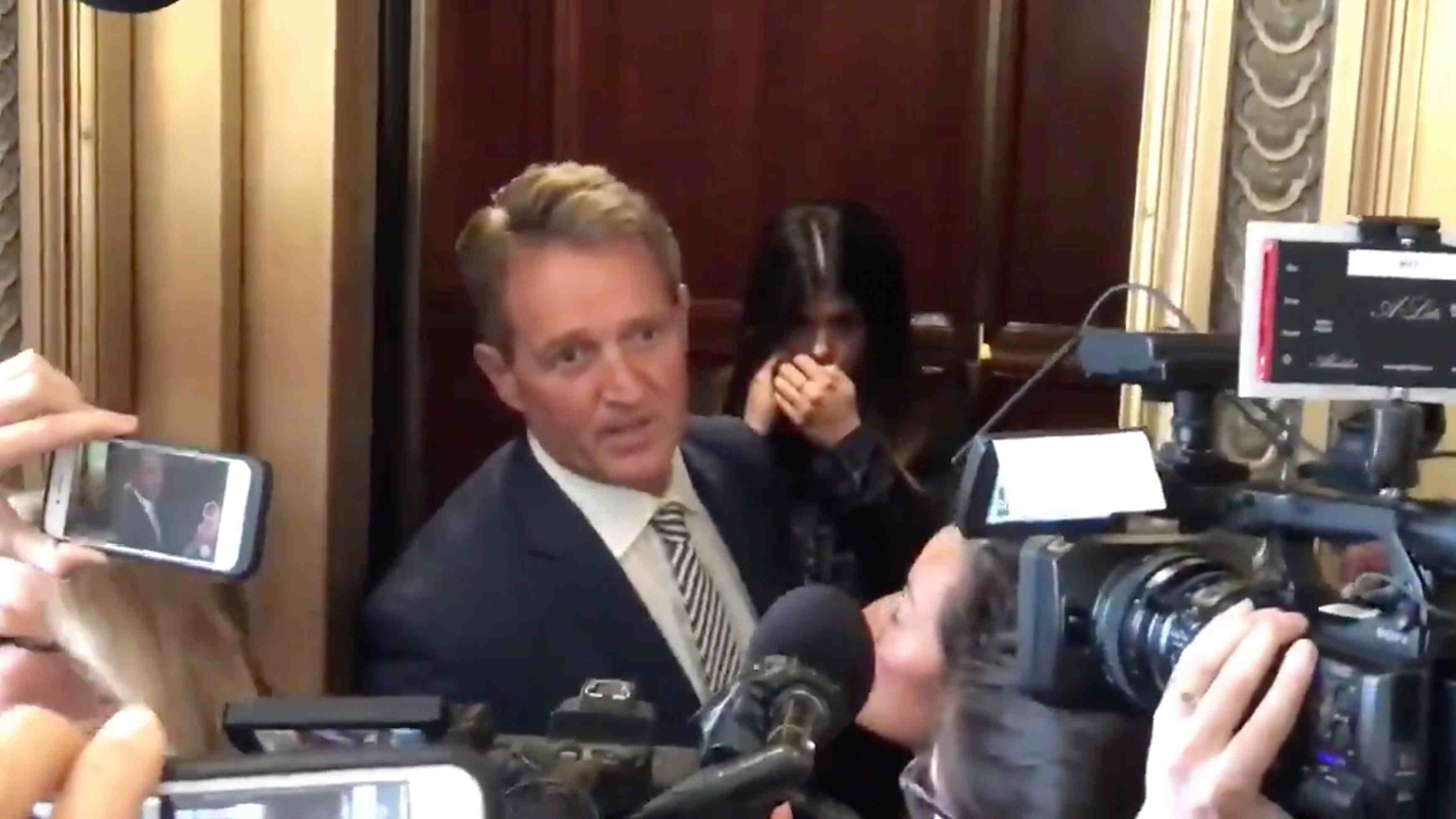 US Senator Jeff Flake reacts during a confrontation with a protester in an elevator