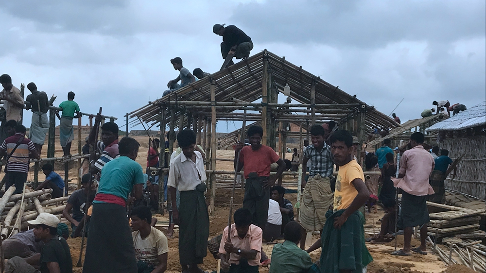 Rohingya refugees use bamboo poles to build shelters at Kutupalong refugee camp in Cox's Bazar, Bangladesh. /CGTN Photo