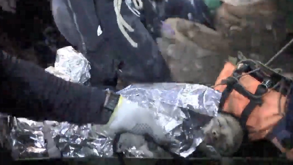 A member of the "Wild Boars" Thai youth soccer team is being moved on a stretcher during a rescue operation inside the Tham Luang cave in Khun Nam Nang Non Forest Park in Mae Sai district, July 11, 2018. /VCG Photo