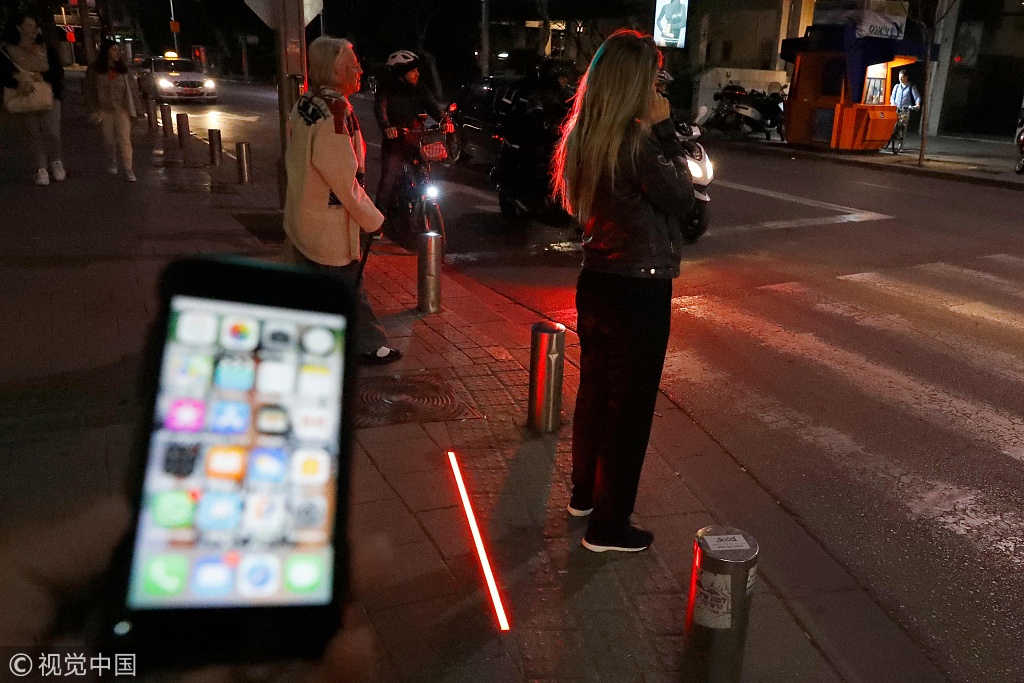 Smartphone and network are absolutely changing our lifestyles. Pictures taken on March 12, 2019 show LED ground level lights installed to warn texting pedestrians before crossing the road in the coastal city of Tel Aviv, Israel. / VCG Photo