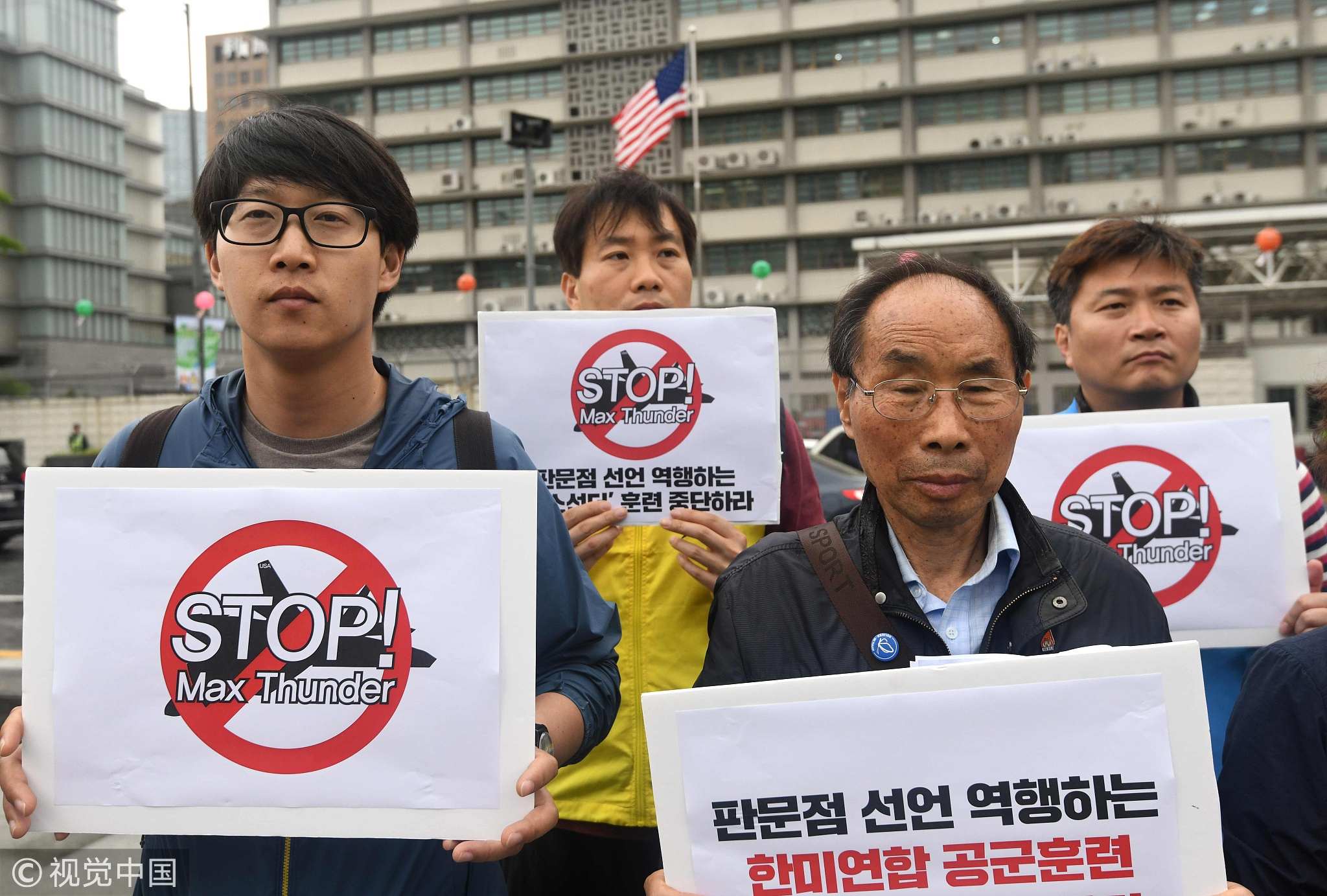 Peace activists in the ROK hold placards reading "Stop! Max Thunder," during a rally denouncing ROK-US joint military drills, in front of the US embassy in Seoul, May 16, 2018. /VCG Photo