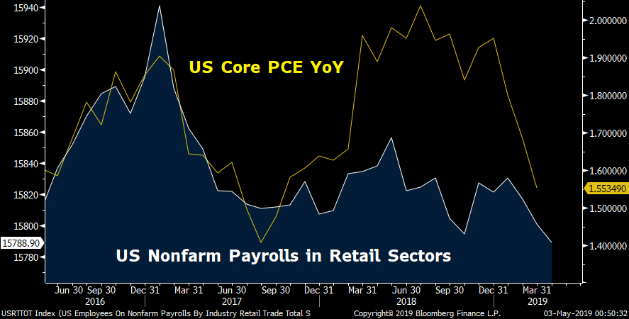 Many sectors, including healthcare and construction, posted gains. However, retail employment fell by 12,000, a third consecutive month of decline, suggesting signs of deceleration in personal consumption, potentially threatening the outlook for inflation. The chart below shows that U.S. core PCE growth on a year-on-year basis has been moving in tandem with the number of jobs in retail sectors.