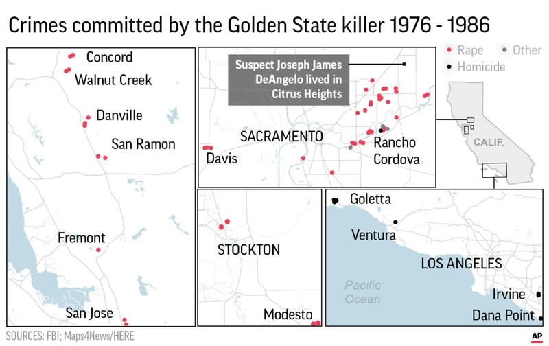 Investigators arrested DeAngelo on Tuesday after matching crime-scene DNA with genetic material stored in an online database by a distant relative. They relied on a different website than in the Oregon search, and did not seek a warrant for his DNA. Instead, they waited for him to discard items and swabbed them for DNA, which proved a conclusive match to evidence from crimes more than 30 years ago, they said.