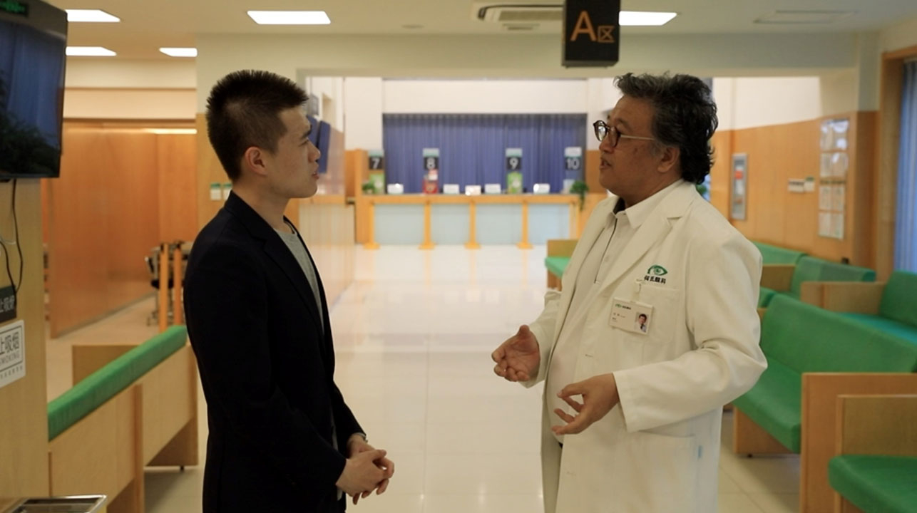 Dr. He Wei (R), the founder and president for He Eye Specialists Hospitals, speaks with CGTN’s Xu Xinchen in one of his hospitals. /CGTN Photo
