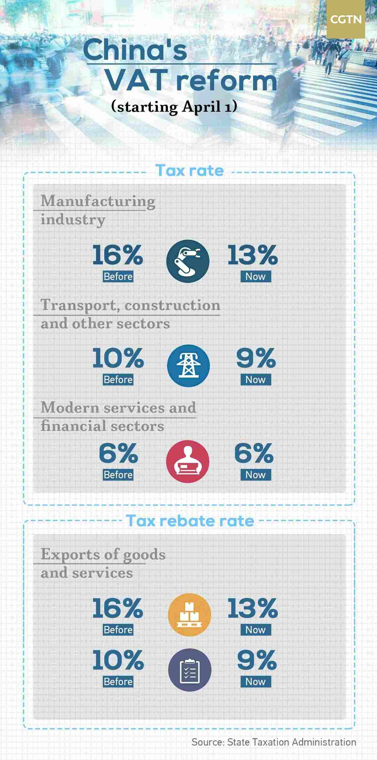 China has set out a plan for the large-scale tax cut, including lowering the VAT rate in manufacturing and other industries from 16 to 13 percent and that in transportation, construction and other industries from 10 to 9 percent.