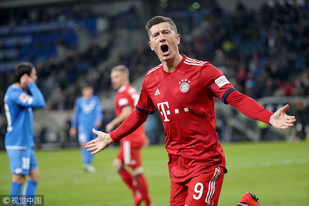 Robert Lewandowski of Bayern Munich scores the 3rd goal during the Bundesliga match between Hoffenheim and Bayern Muenchen at Wirsol Rhein-Neckar-Arena in Sinsheim, Germany, January 18, 2019. /VCG Photo