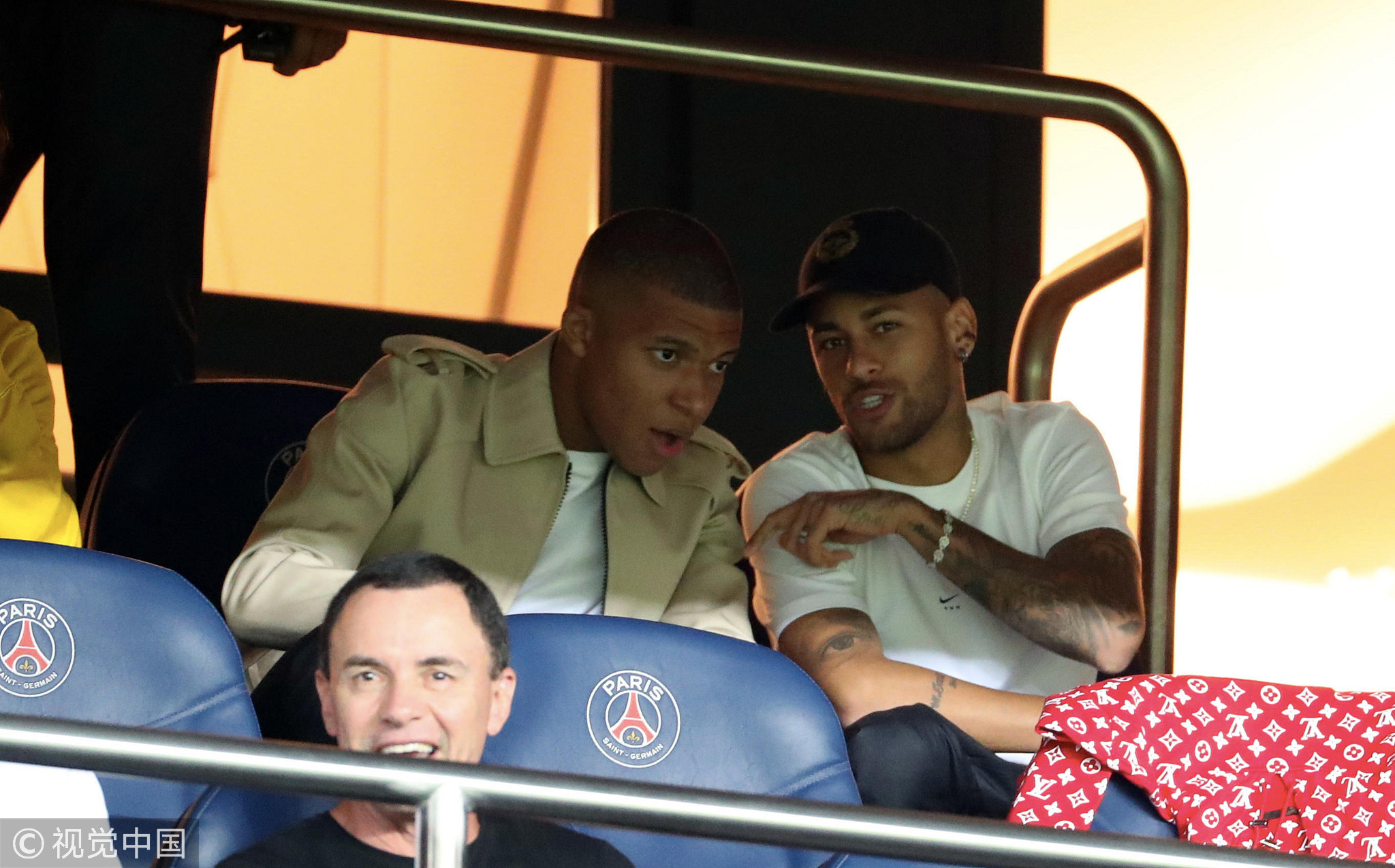 Mbappe and Neymar (R) chat in the stands during PSG's win. /VCG Photo