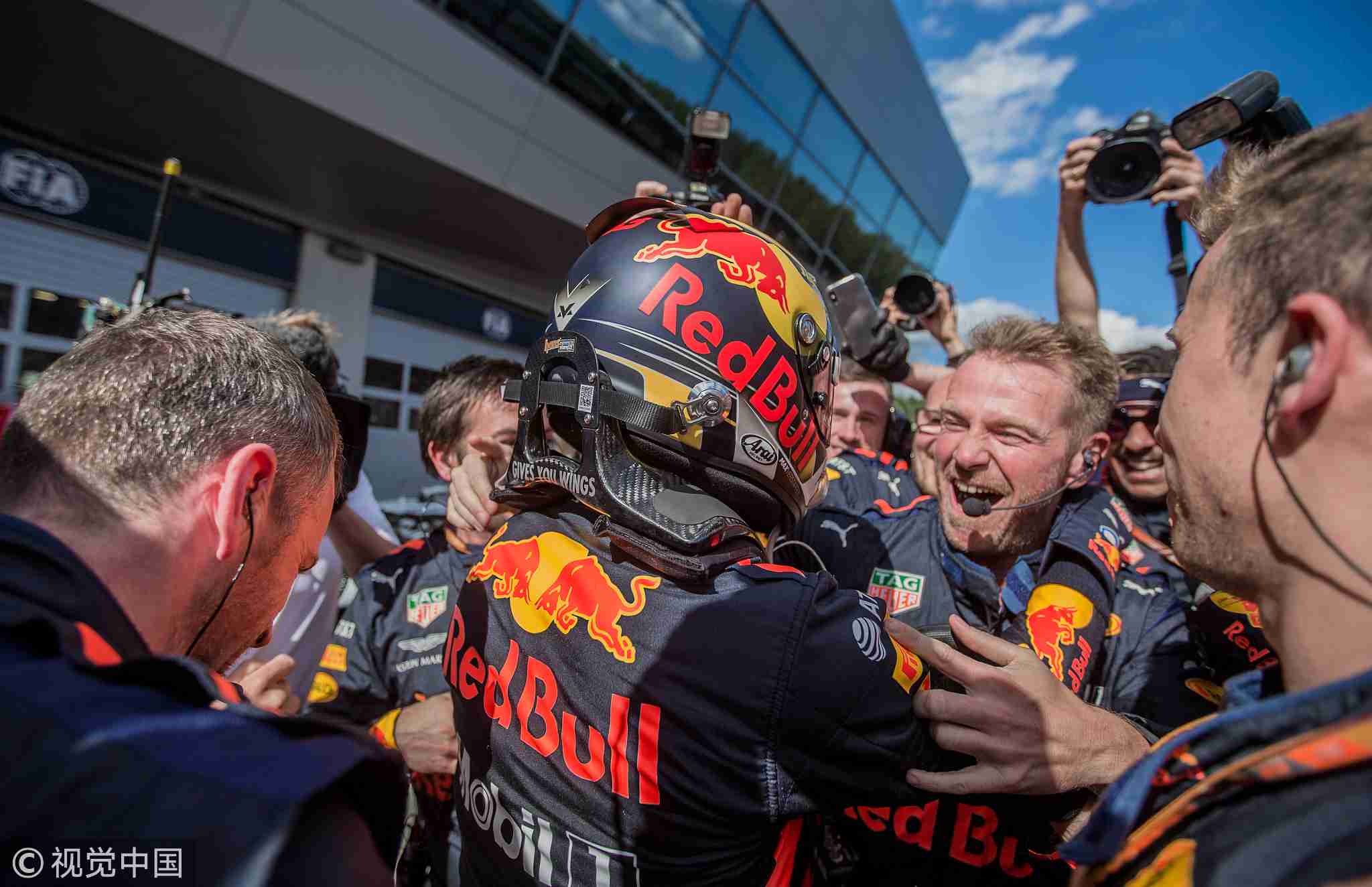 The winner Max Verstappen celebrates with his team after he won the race at Formula One Austrian Grand Prix at Red Bull Ring, July 1, 2018, in Spielberg, Austria. /VCG Photo