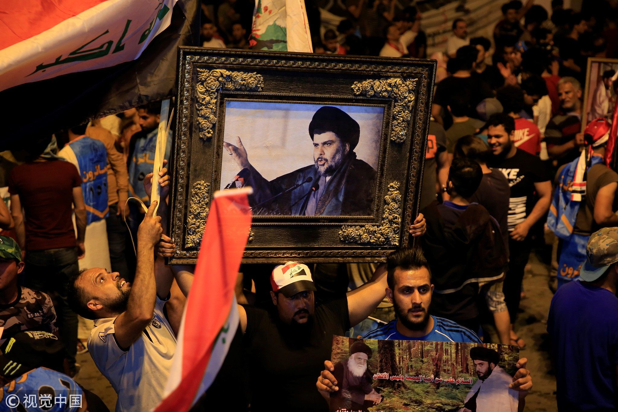 Supporters of Iraqi Shiite cleric Moqtada al-Sadr celebrate the results of the parliamentary election at the Tahrir Square, Baghdad, Iraq May 13, 2018. /VCG Photo