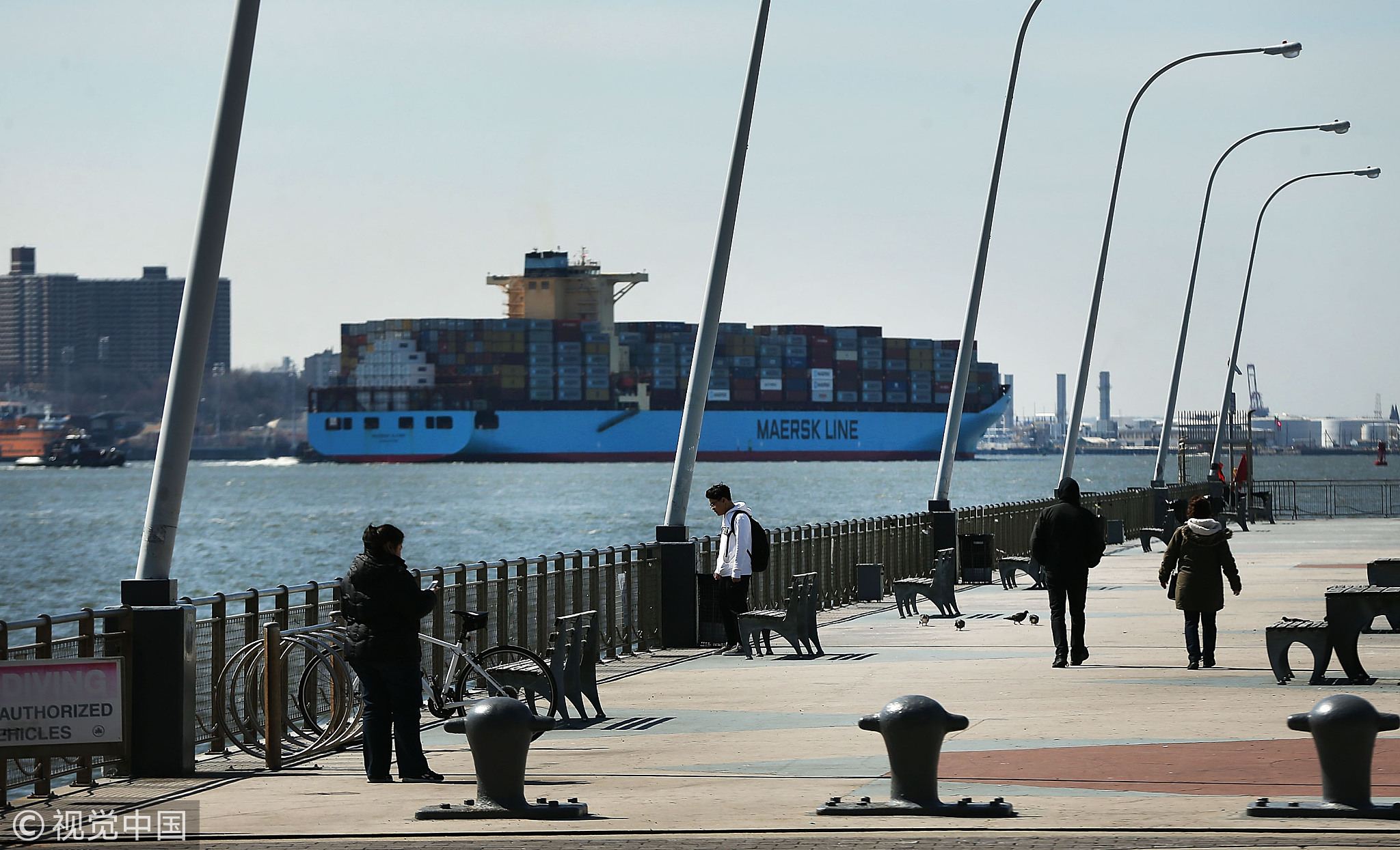 A cargo ship owned by Maersk arrives into New York harbor in New York City on Apr 9, 2018. /VCG Photo