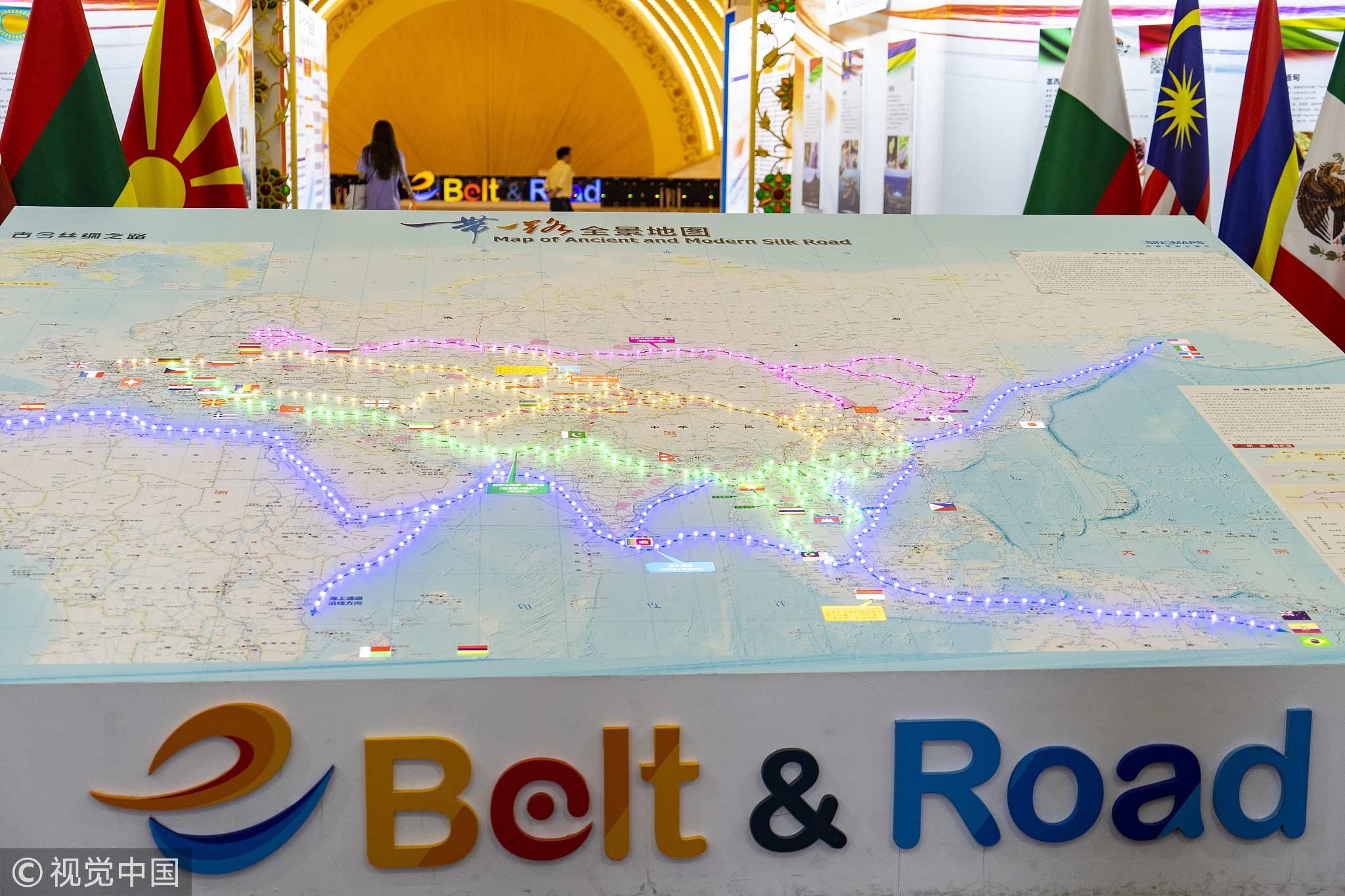 Map of ancient and modern Silk Road shown at a BRI exhibition in Shanghai, China, June 30, 2018. /VCG Photo