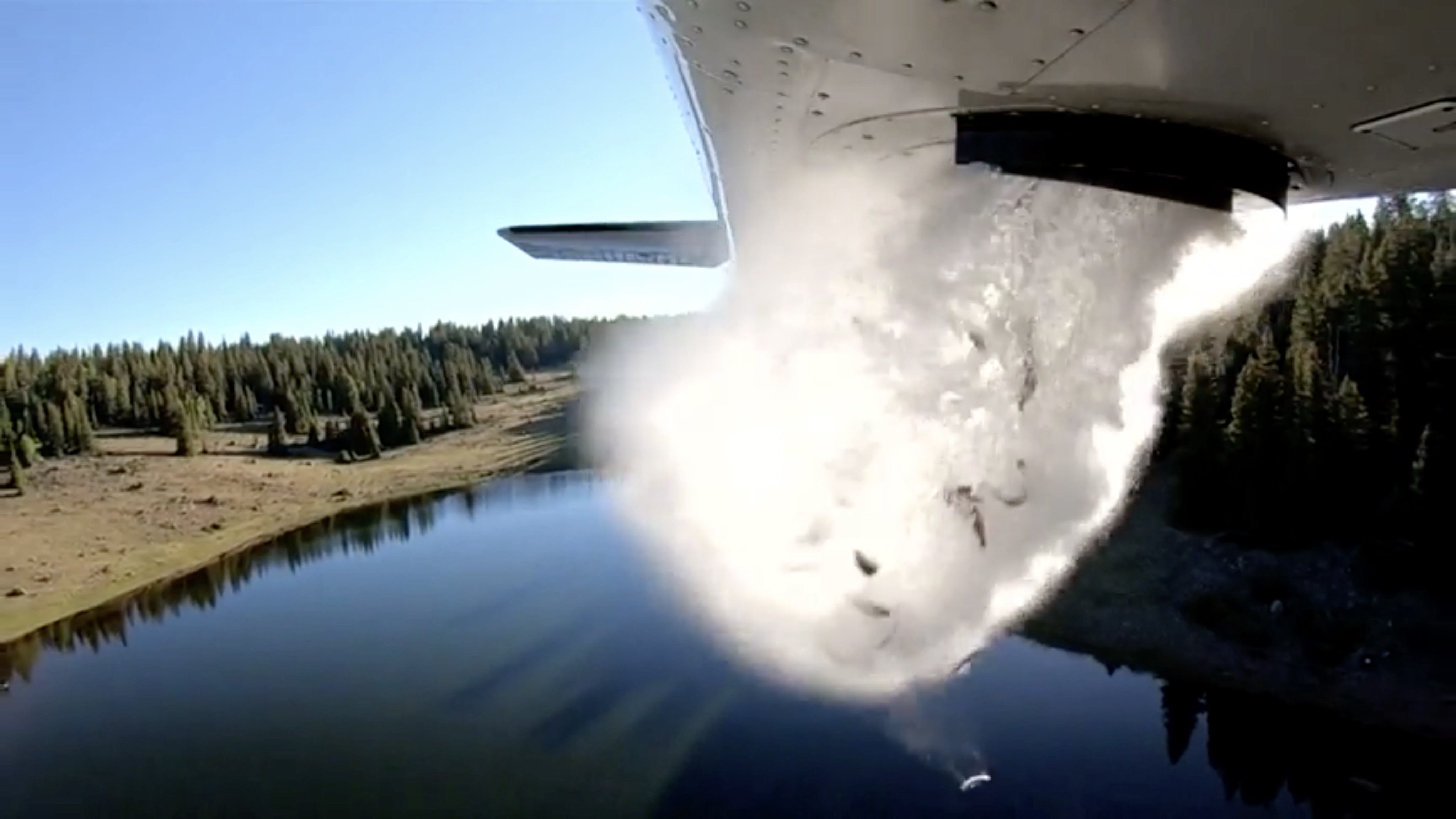 The video shows young “fingerling” fish being dropped from the skies into lakes. It is said to be a very cost-effective method to replenish fish stocks. Aerial fish stocking has been used in the US state of Utah for over 60 years.