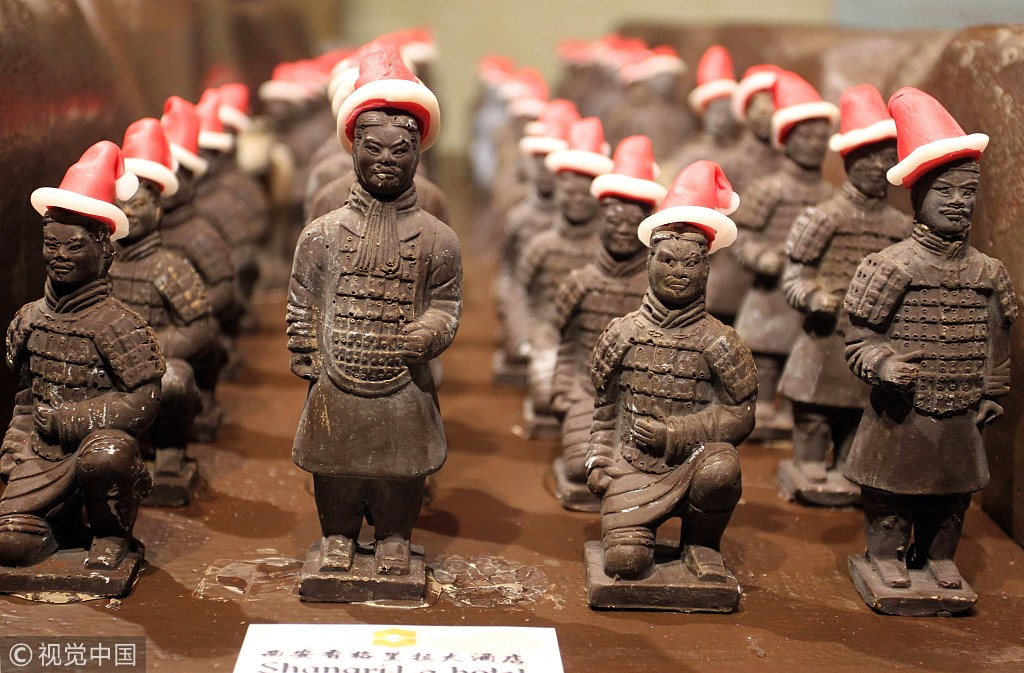 Christmas Terracotta warrior chocolates displayed in Xi'an Shangri-la Hotel on November 21, 2014. /VCG Photo