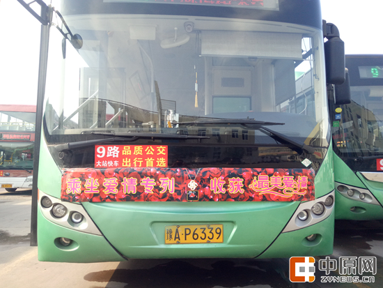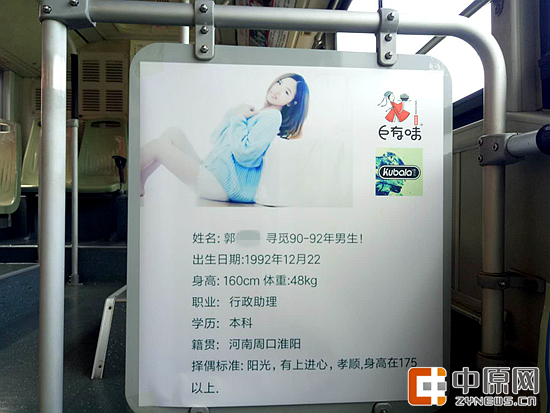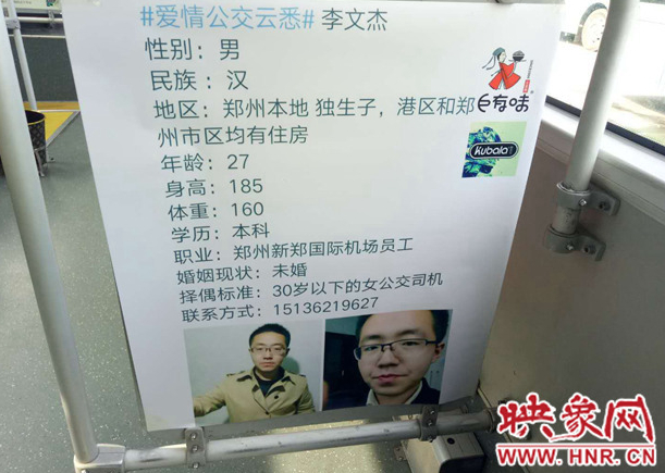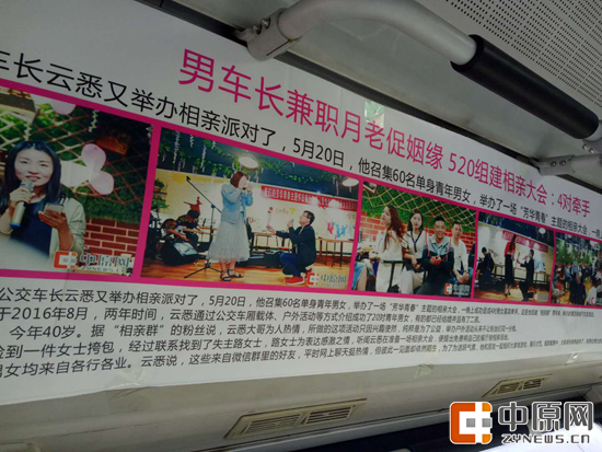 A banner hangs promoting matchmaking under the bus' windshield. /Photo via zynews.cn