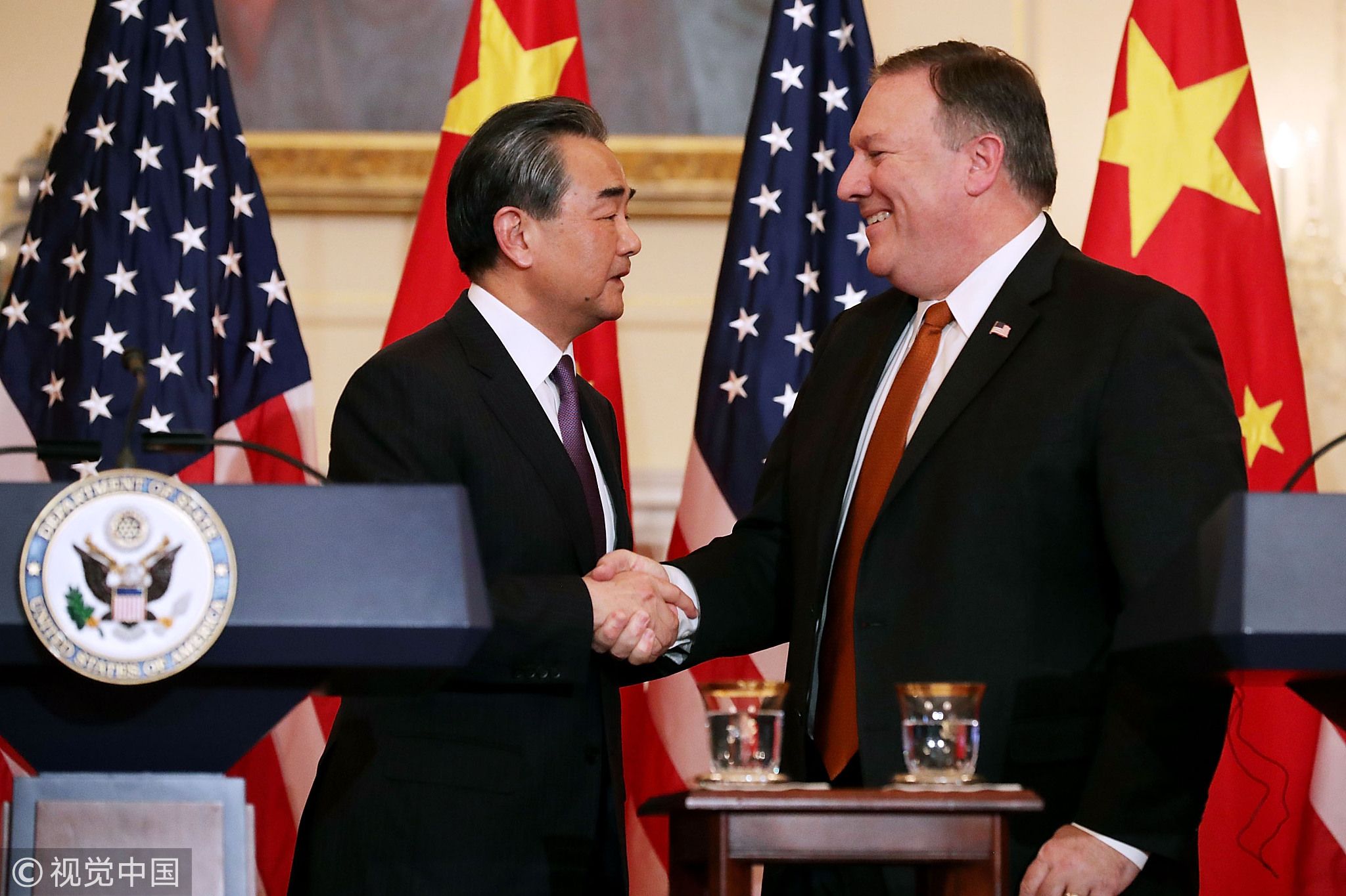 US Secretary of State Mike Pompeo (R) shakes hands with Chinese Foreign Minister Wang Yi following a news conference in the Benjamin Franklin Room at the State Department's Harry S. Truman headquarters building, May 23, 2018, in Washington, DC. /VCG Photo
