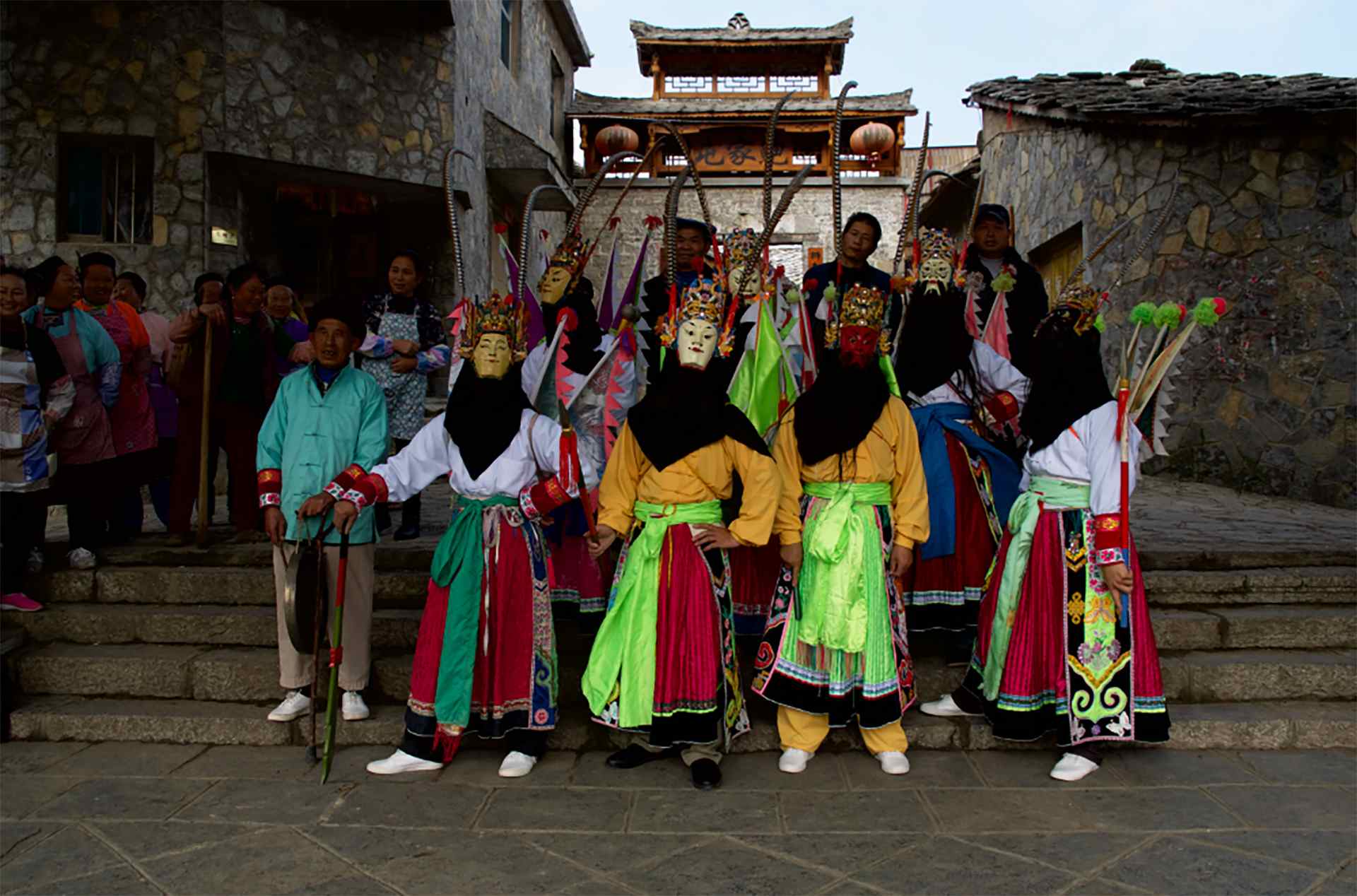 Nuo Opera performers pose for a group photo at the end of a show. /CGTN Photo | Daken Art
