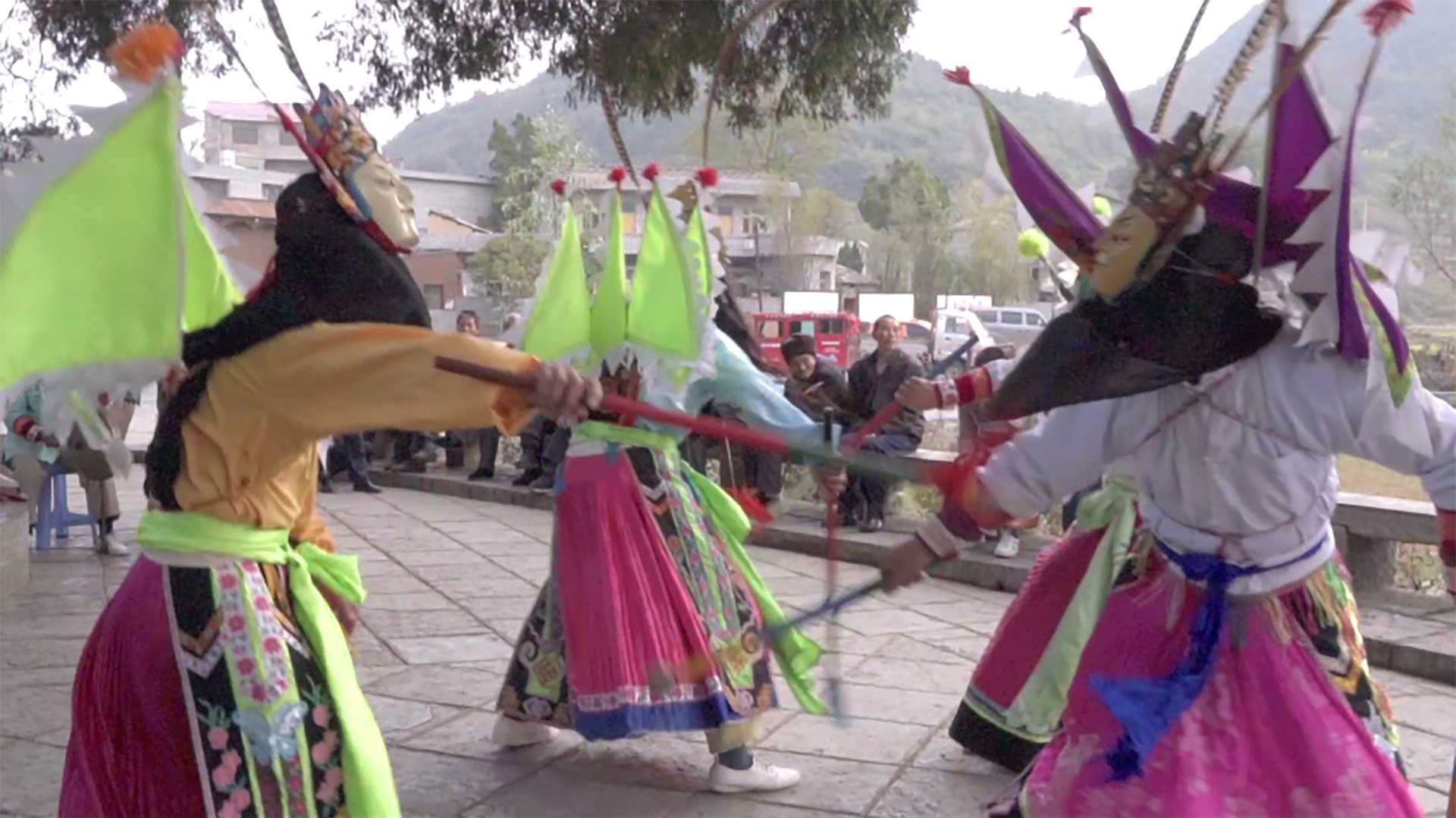 The performers from Baojiatun and other nearby villages performing Nuo Opera /CGTN Photo | Daken Art