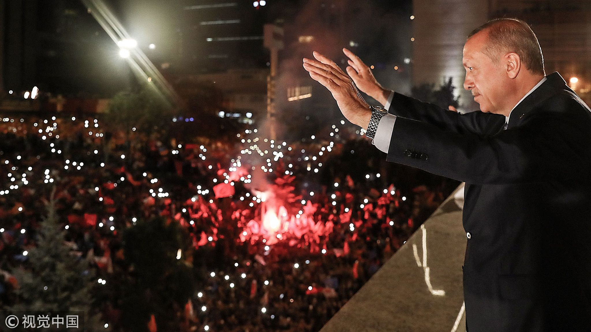 June 24, 2018: Turkish President Tayyip Erdogan waves to supporters gathered at the headquarters of the AK Party to celebrate Erdogan's victory in the election, in Ankara, Turkey. /VCG Photo