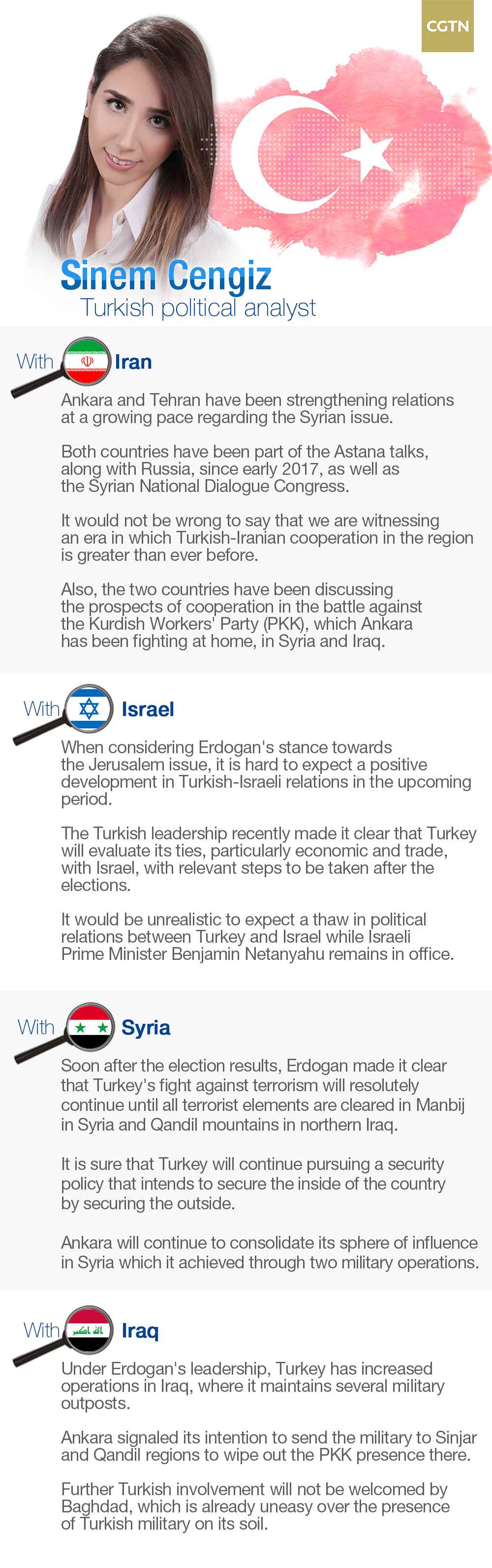 In an email interview with CGTN Digital, Sinem Cengiz, a Turkish political analyst who specializes in Turkey's relations with the Middle East, weighed in on the possible development of ties between Turkey and its key neighbors in the region: