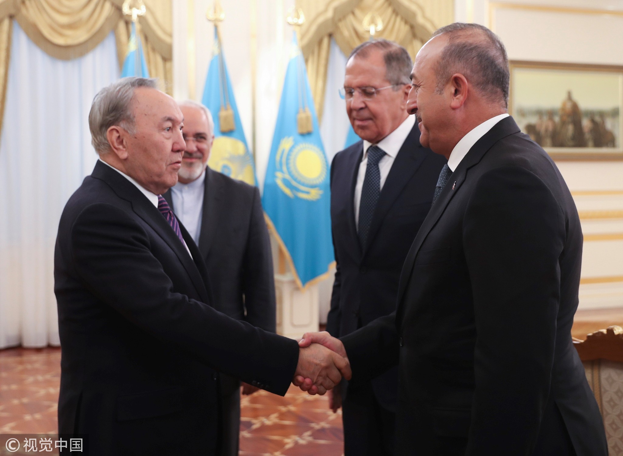 March 16, 2018: Turkish Foreign Affairs Minister Mevlut Cavusoglu (R) shakes hands with President of Kazakhstan Nursultan Nazarbayev (L) as they are flanked by Russian Foreign Minister Sergei Lavrov (2nd R) and Iranian Foreign Minister Mohammad Javad Zarif (2nd L) after the ninth round of Syria peace talks in Astana, Kazakhstan.