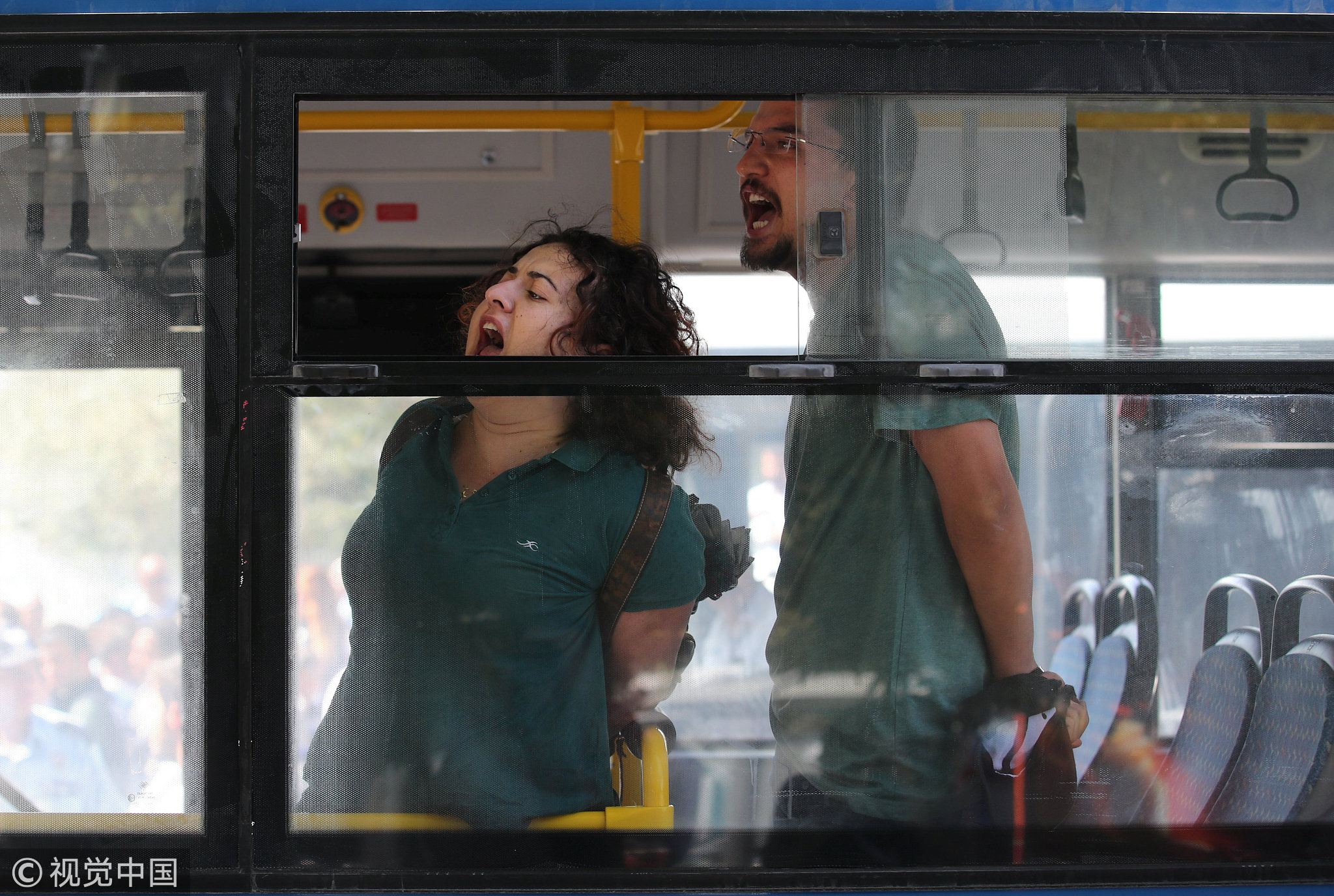 Protesters shout slogans on a police bus after they were detained by riot police during the trial of two Turkish teachers, who went on a hunger strike over their dismissal under a government decree following the 2016 failed coup, outside of a courthouse in Ankara, Turkey, September 14, 2017. /VCG Photo