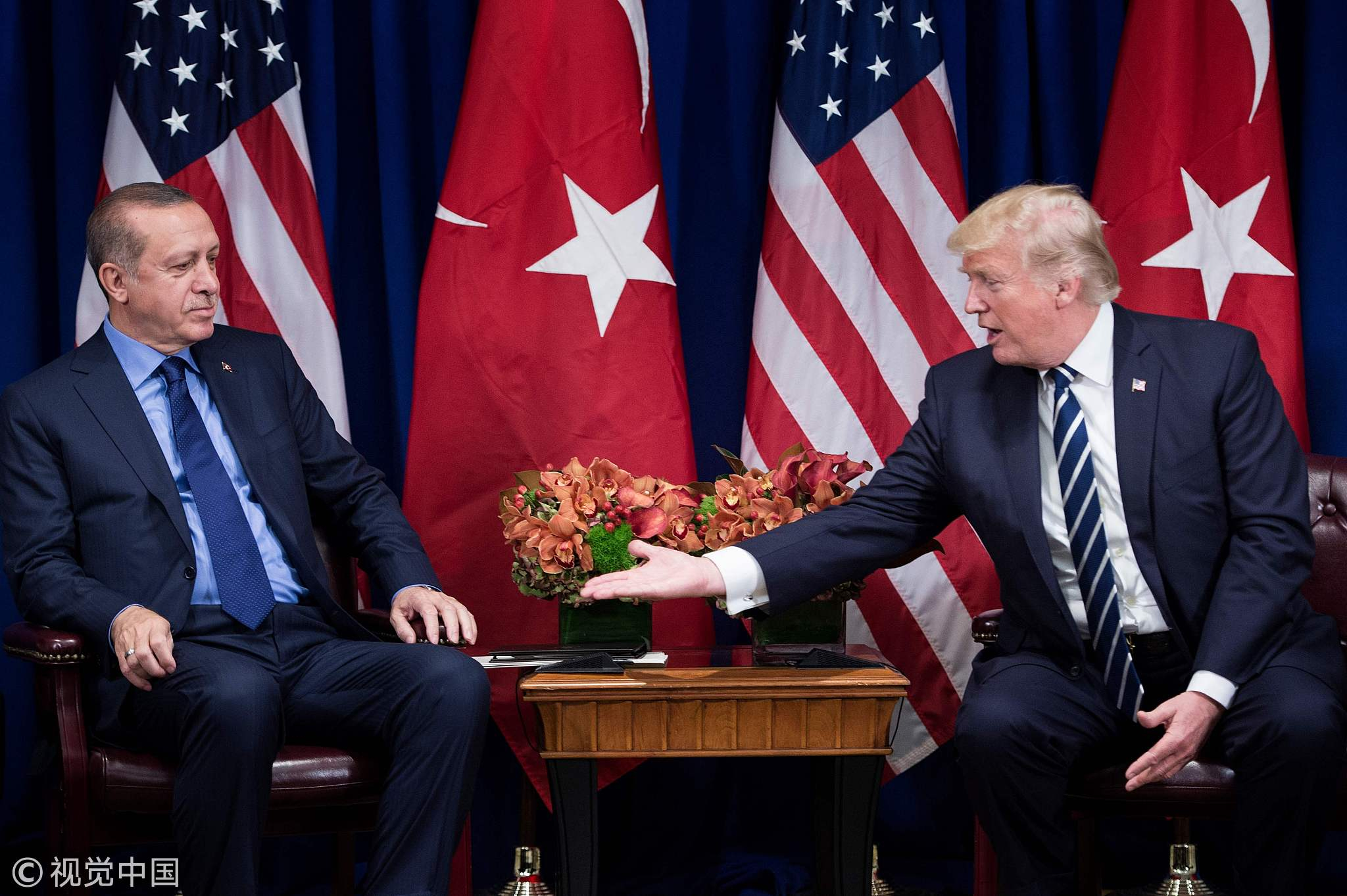 September 21, 2017: US President Donald Trump reaches to shake Turkey's President Recep Tayyip Erdogan's hand before a meeting at the Palace Hotel during the 72nd United Nations General Assembly in New York, the US. /VCG Photo