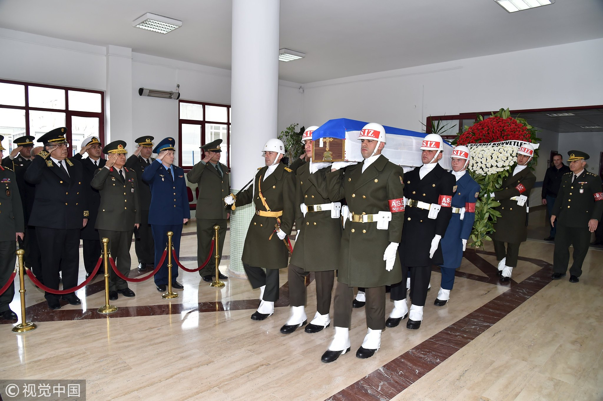 November 30, 2015: The coffin of the pilot killed when Turkey shot down a Russian jet is carried out of a military hospital morgue by Turkish soldiers for its transfer to Esenboga Airport in Ankara, Turkey. /VCG Photo