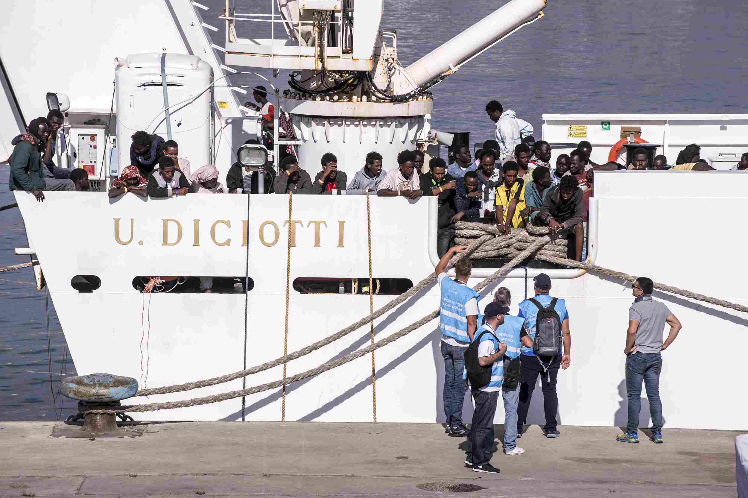 Early Saturday, the migrants were taken off the boat and transferred onto a rescue vessel from the EU border patrol agency Frontex and a ship from the Italian border police.