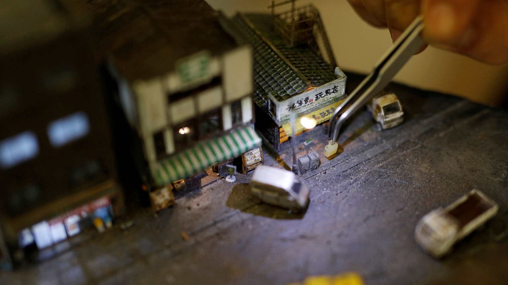 The designer, who wanted to preserve his memory, created the realistic diorama of the street scenes in staggering detail, including cars, motorcycles, shops, claw machines and residential buildings. /VCG Photo