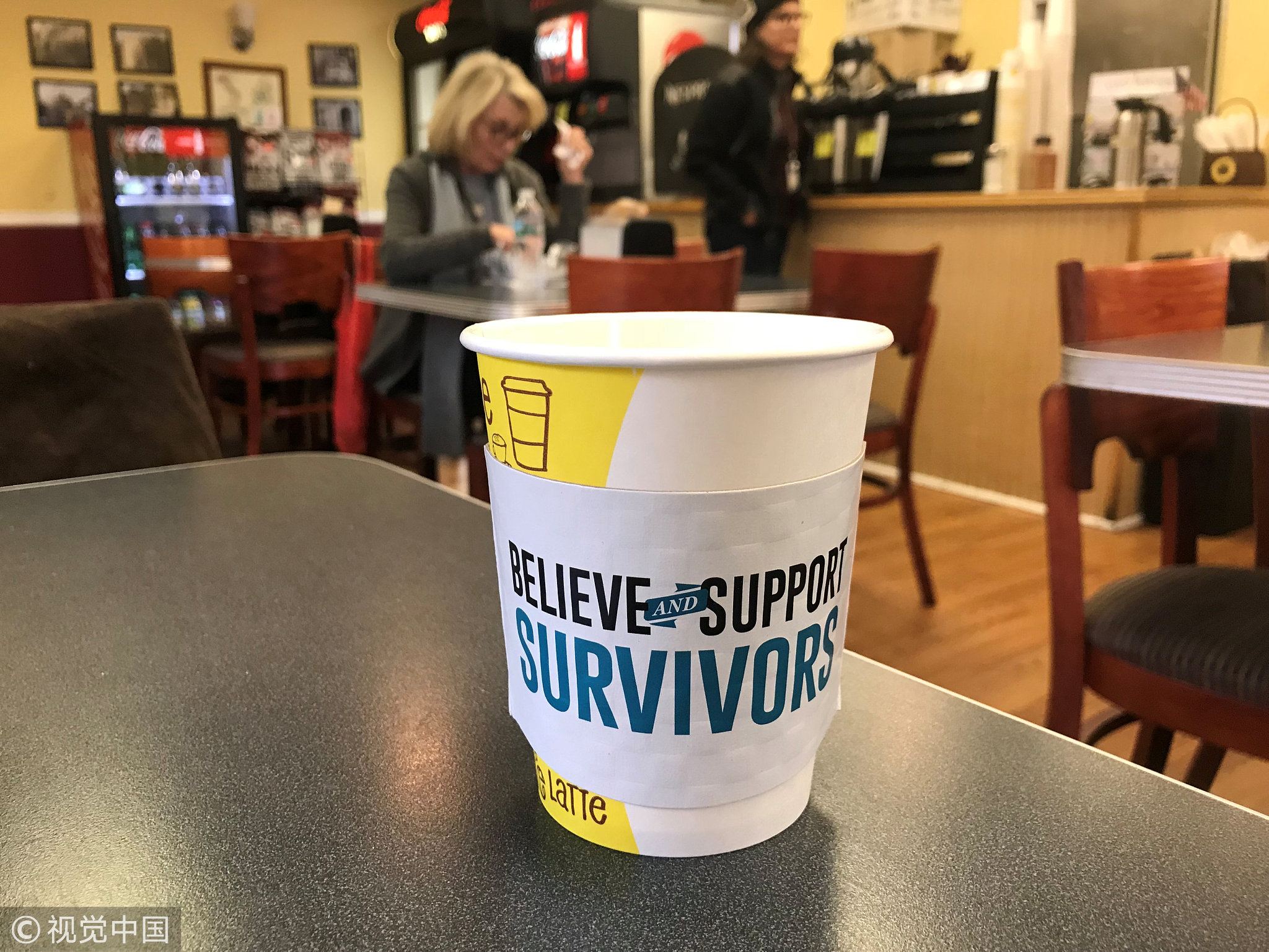 April 17. 2018: A coffee cup wrapped with a #MeToo movement message sleeve is seen at SassanoÕs Cafe near the Pennsylvania courthouse where Bill Cosby's sexual assault retrial is taking place in Norristown, Pennsylvania, US. /VCG Photo
