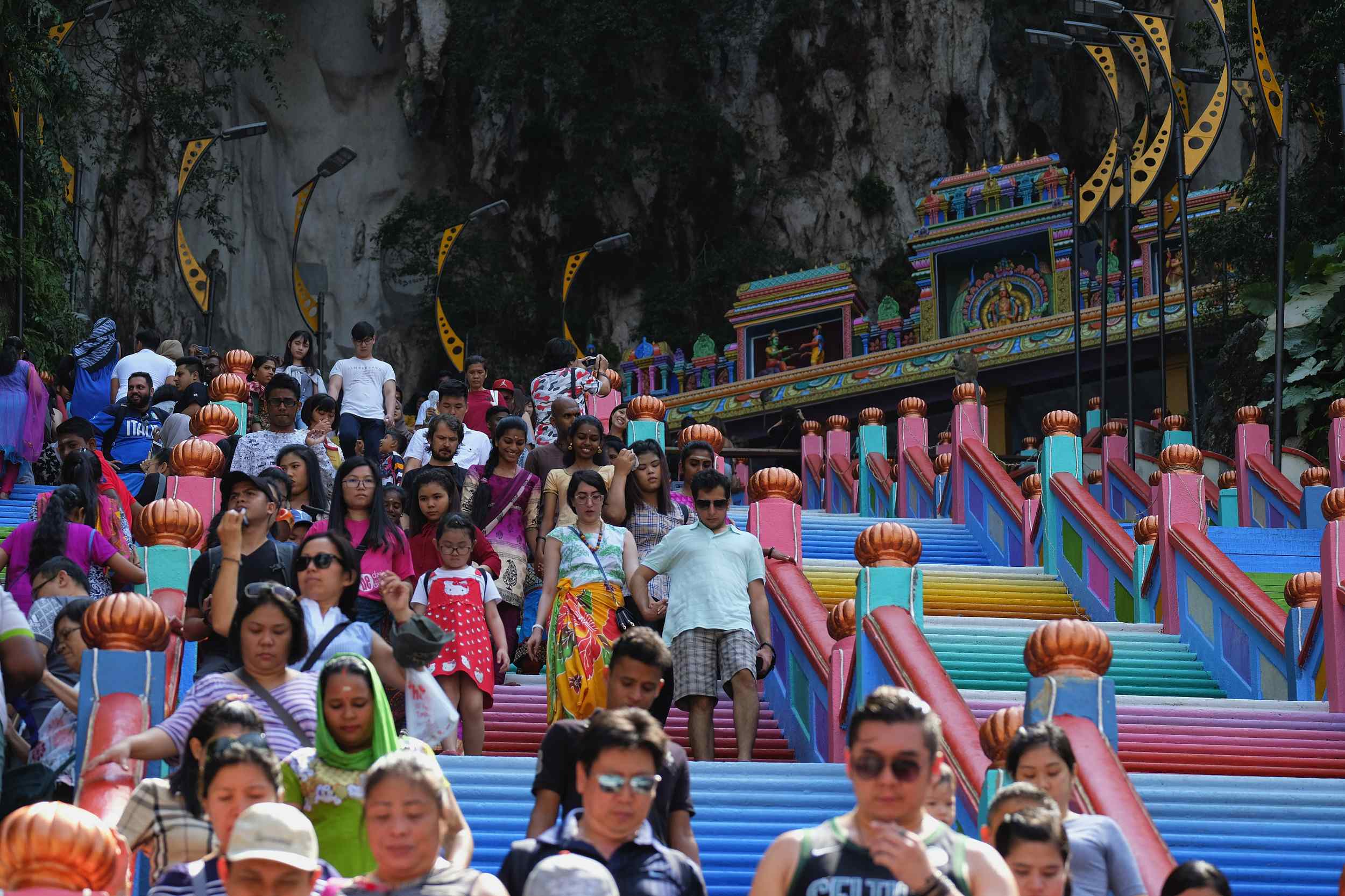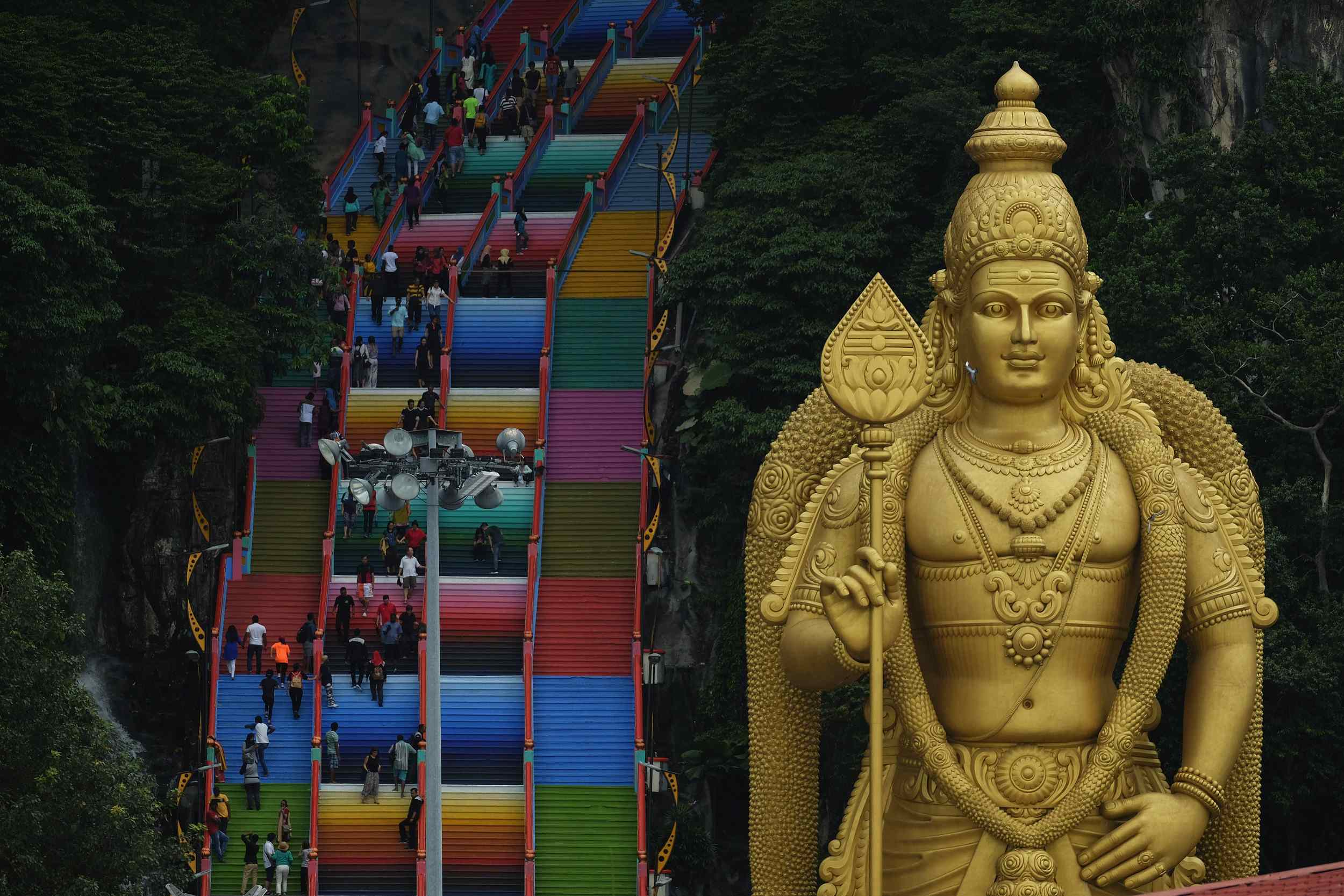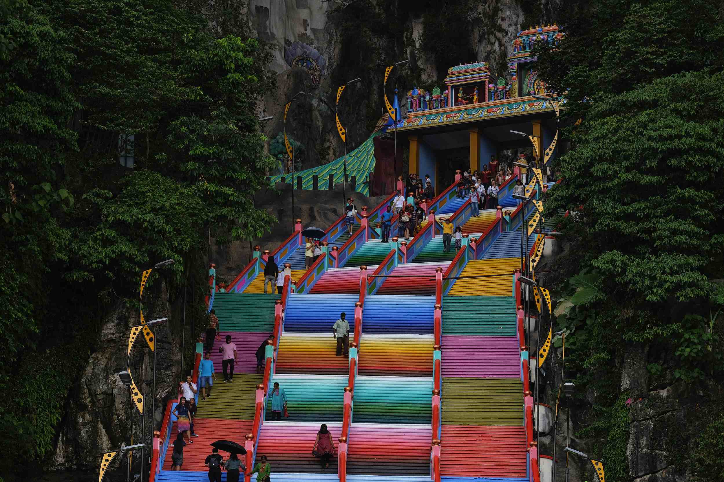Visitors are seen walking on the 272-step colored stairs to the Batu Cave Temple (also named Sri Subramaniar Swamy Temple) near Kuala Lumpur, Malaysia on Saturday. /VCG Photo