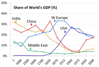 The global contribution to world's GDP by major economies from 1CE to 2008CE according to Angus Maddison's estimates.