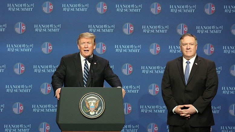 U.S. President Donald Trump (L) with Mike Pompeo, U.S. Secretary of State, during a news conference following the DPRK-U.S. summit in Hanoi, Vietnam, February 28, 2019. /VCG Photo