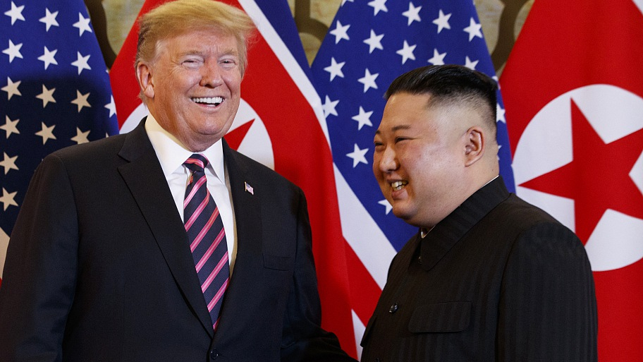 U.S. President Donald Trump (L) and DPRK leader Kim Jong Un sharing a laugh before a summit meeting at the Sofitel Legend Metropole, Hanoi, Vietnam, February 27, 2019. /VCG Photo