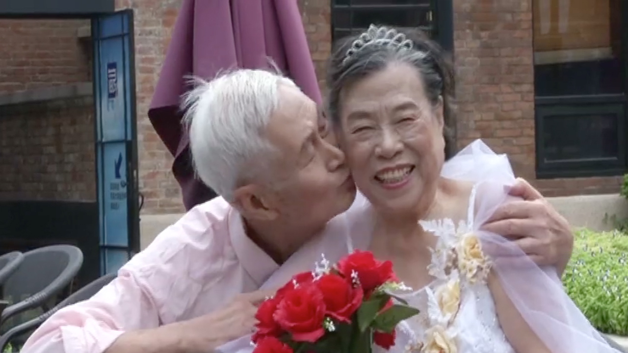 Three elderly couples posed in Western-style wedding gowns for photos in China's northern port city of Tianjin on Thursday to mark this year's Chinese Valentine's Day.