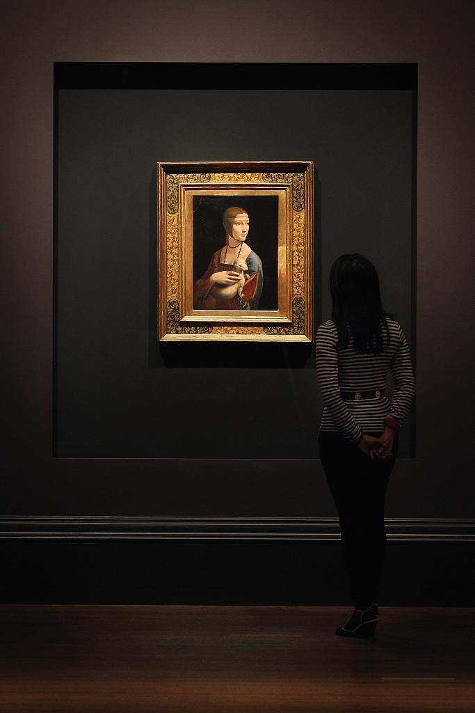 A gallery employee poses beside a painting by Leonardo da Vinci entitled 'Portrait of Cecilia Gallerani,' (The Lady with an Ermine) which forms part of the Leonardo da Vinci: Painter at the Court of Milan exhibition at the National Gallery on November 07, 2011 in London, England. /VCG Photo