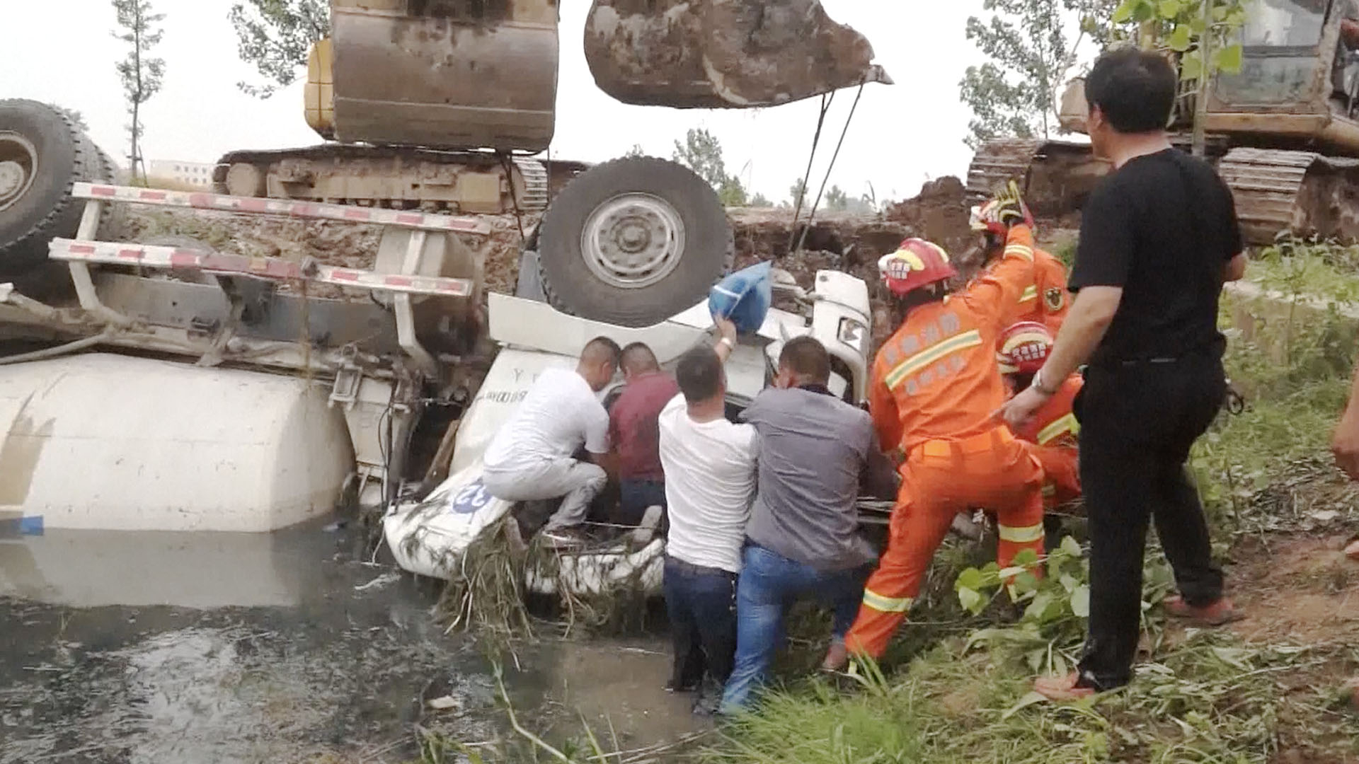 Villagers and firefighters made joint efforts to rescue a trapped driver after his concrete mixer truck plunged into a ditch and turned over on Wednesday in east China's Anhui Province. After over two-hour joint efforts by the villagers and firefighters, the driver was rescued and sent to the hospital.