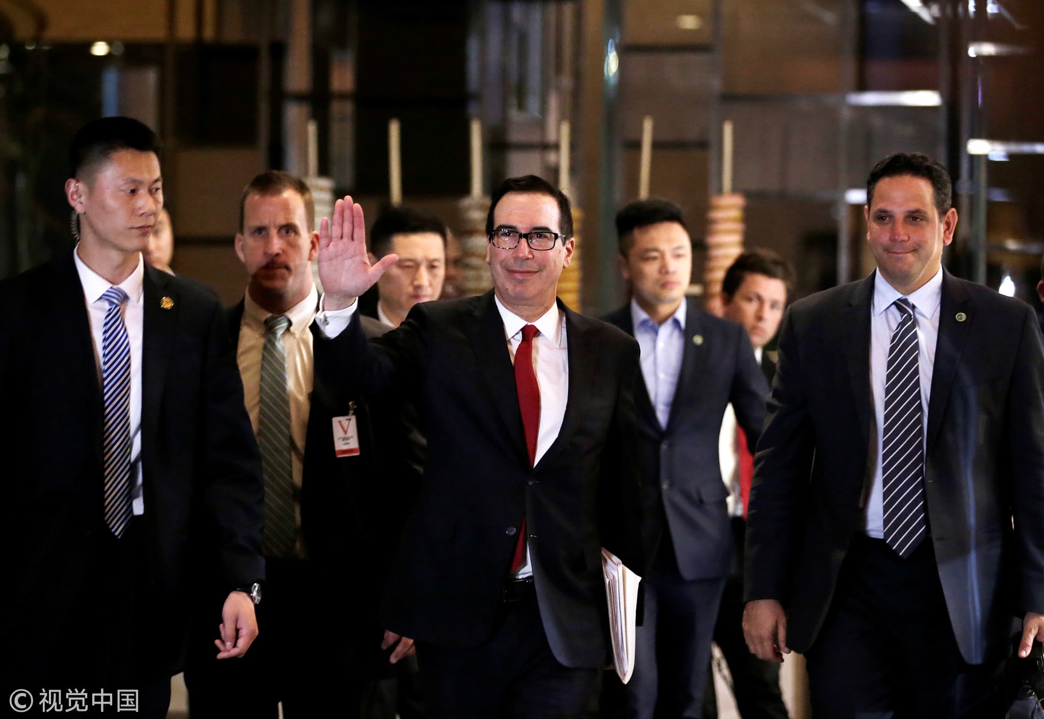 US Treasury Secretary Steven Mnuchin, a member of the US trade delegation to China, waves to the media as he returns to a hotel in Beijing, May 3, 2018./VCG Photo