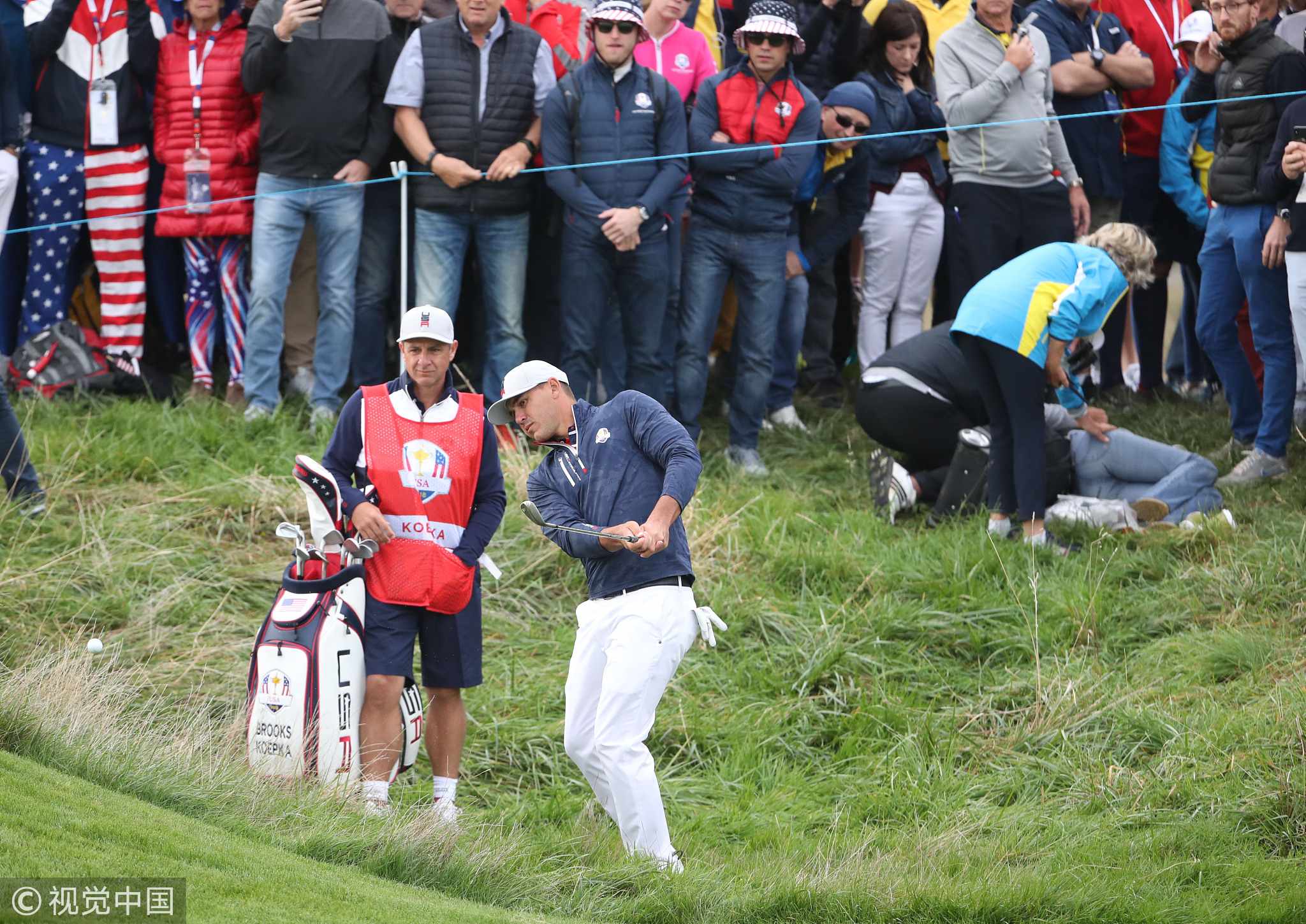 Brooks Koepka of the United States plays his second shot on the sixth hole after his tee shot struck a spectator, September 28, 2018. /VCG Photo