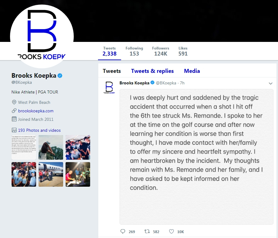 Koepka posted a statement on Twitter saying he had been in contact with Corine Remande and her family and offered his "heartfelt sympathy."